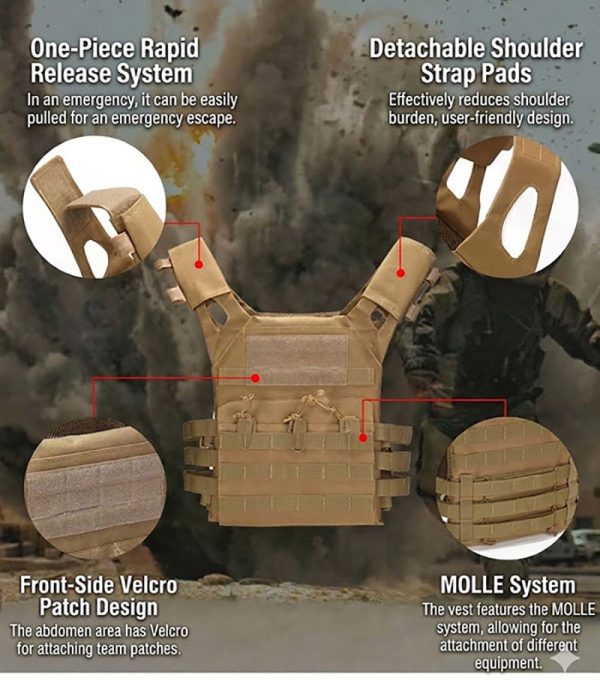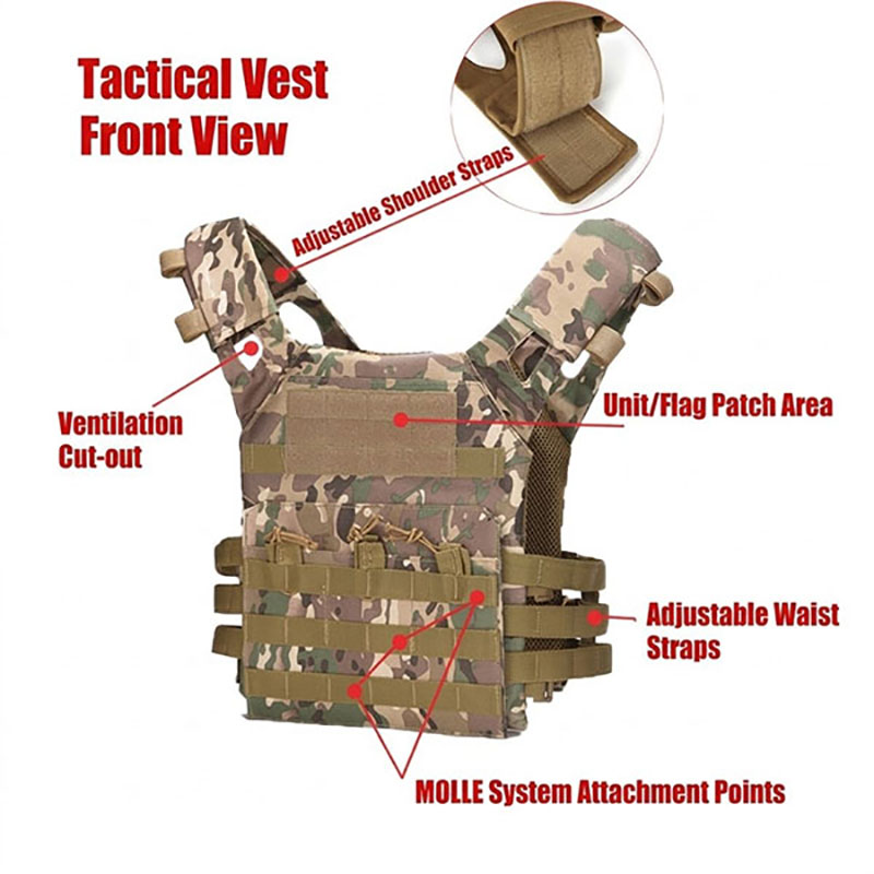 Multiple color options: The product is shown in several colorways, including black, tan, olive, and camouflage. With its structured silhouette and clean panel layout, the vest fits a wide range of tactical, training, and outdoor styling preferences.