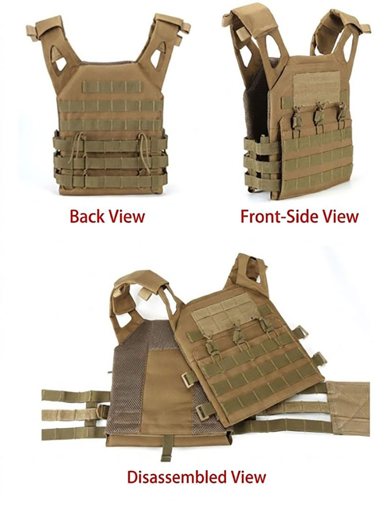 Back, front-side, and disassembled views: These additional views help show the overall shape of the vest from different angles and reveal more of its modular structure. The design suggests convenient adjustment, gear organization, and a balanced profile for tactical simulation or outdoor use.