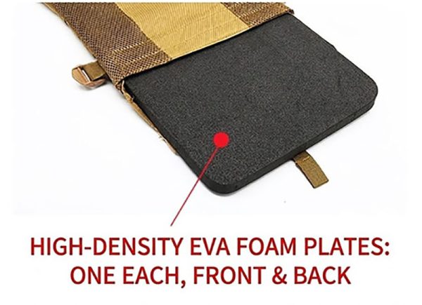 EVA foam plates front and back: The final image shows high-density EVA foam plates for both the front and back. Based on the visual presentation, these inserts help the vest maintain its shape and give it a more structured appearance when worn.
