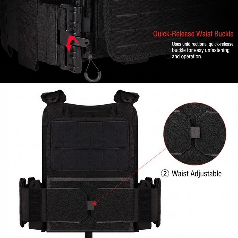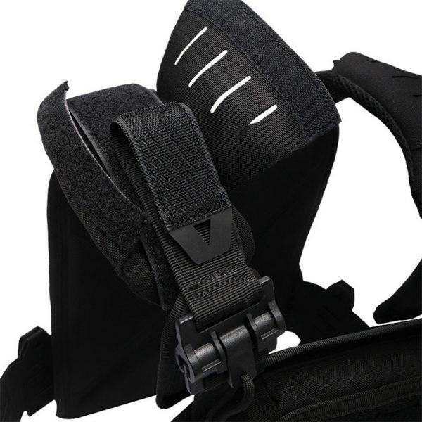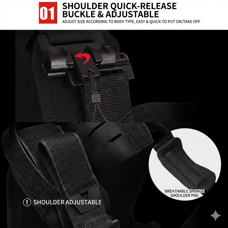 The shoulder area is equipped with quick-release hardware, allowing the vest to be put on or removed more conveniently. This detail is especially useful for airsoft, training, trekking, or any situation that requires faster gear adjustment.