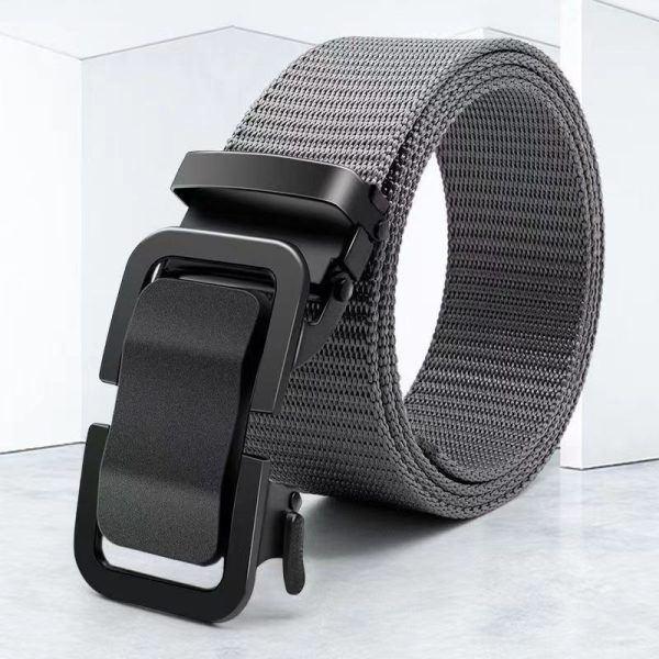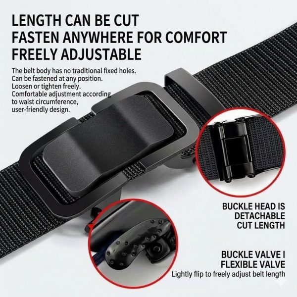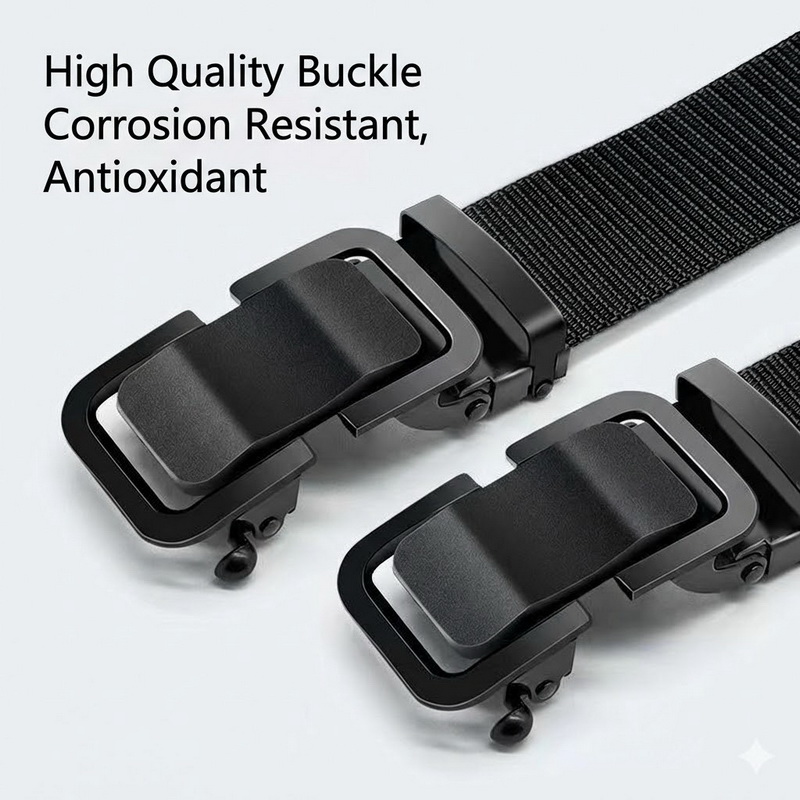 A key visual highlight is the structured quick-release buckle with a firm, angular shape and a smooth matte finish. The buckle looks solid and easy to handle, making the belt suitable for fast on-and-off use while still maintaining a neat appearance for daily wear, travel, or outdoor activities.