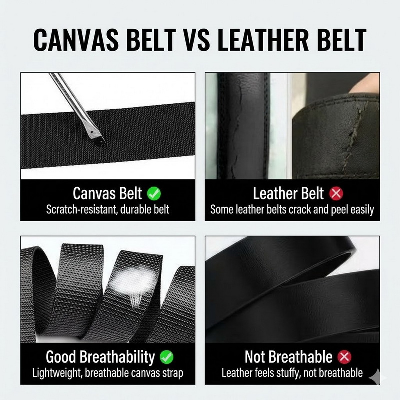 The strap appears to use a breathable woven nylon or canvas-style material with a textured surface. Compared with stiffer leather belts, the illustrated comparison emphasizes a lighter, more flexible, and more comfortable wearing experience, especially for active movement or extended daily use.