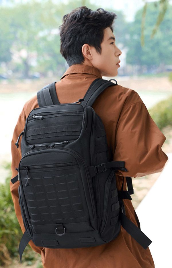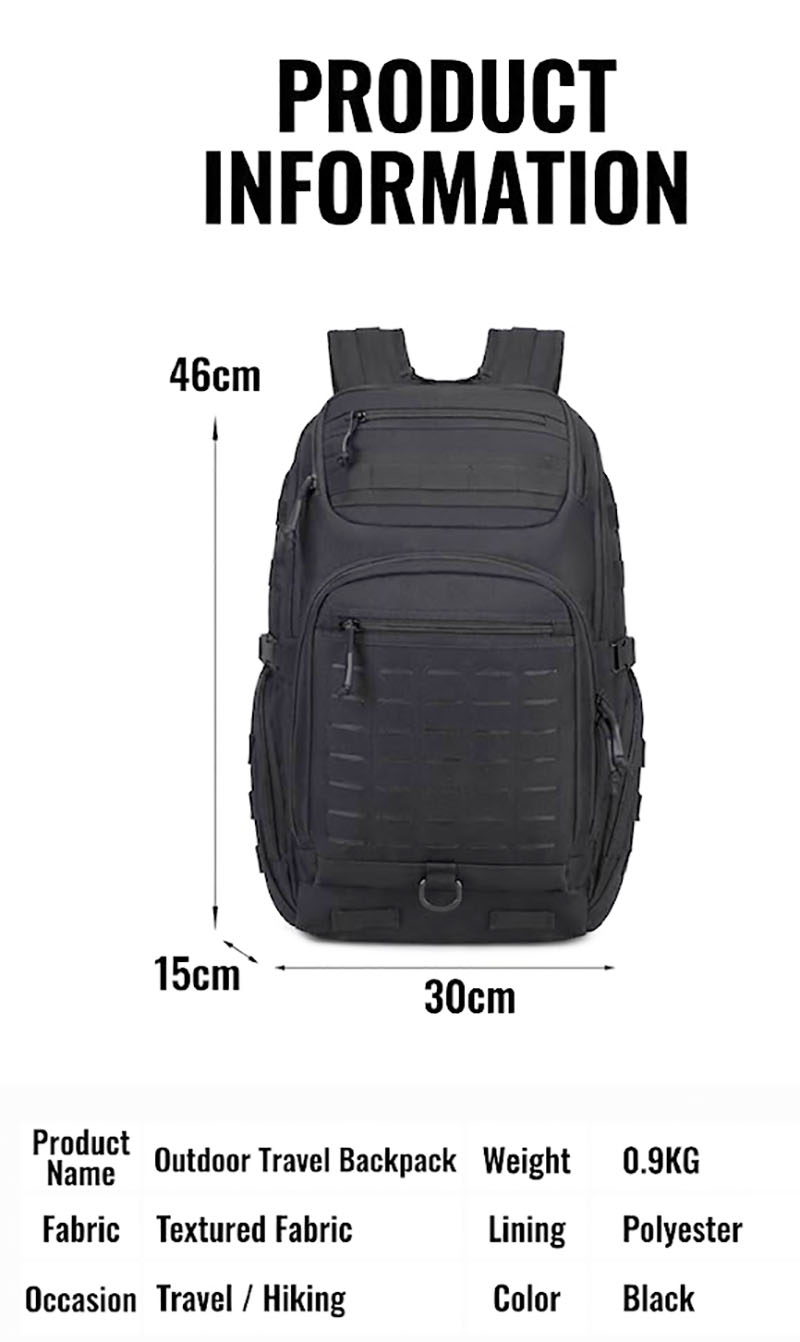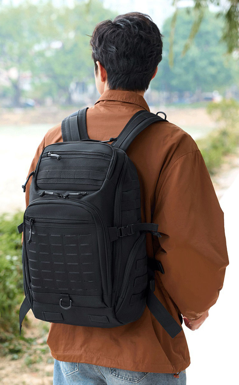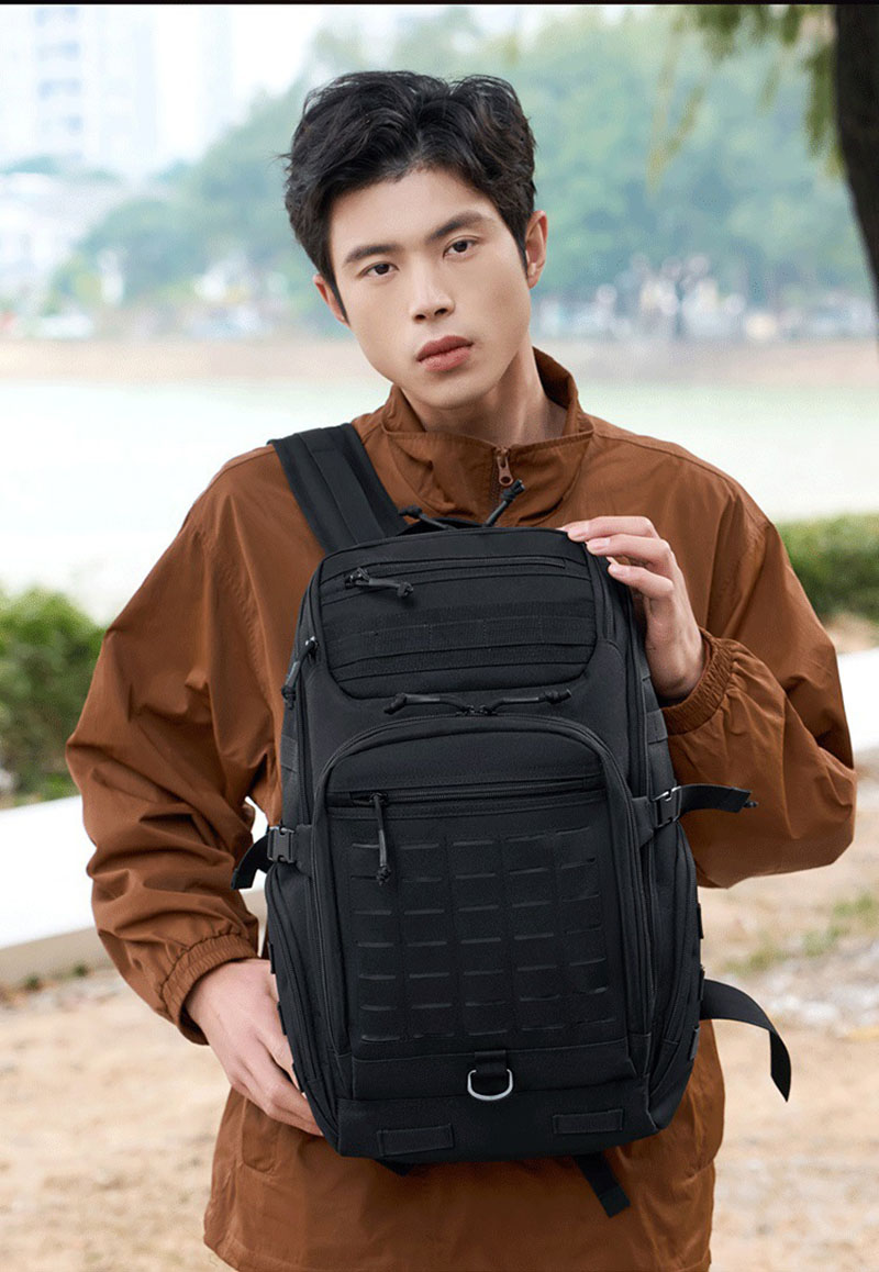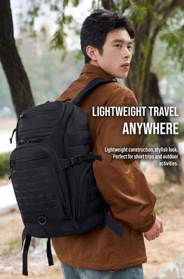 1. Clean Outdoor Style with Everyday Versatility This backpack combines a simple black exterior with a structured, outdoors-ready silhouette that looks practical without feeling bulky. The design works well for travel, casual city use, light hiking, and daily carry, while the tactical-style front webbing and utility details add a more rugged character for customers who like gear with a tactical influence.