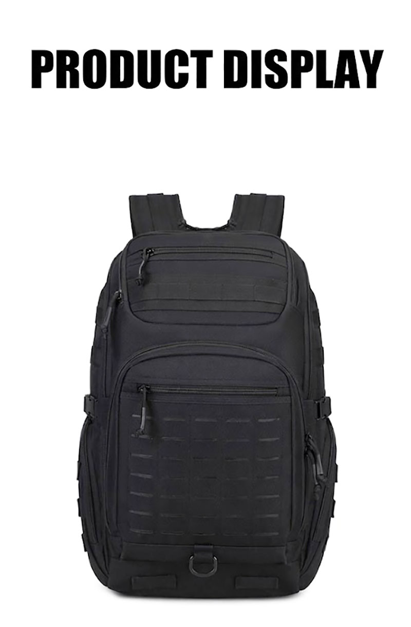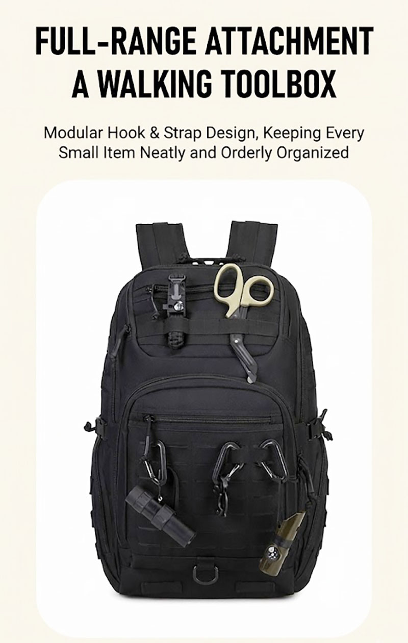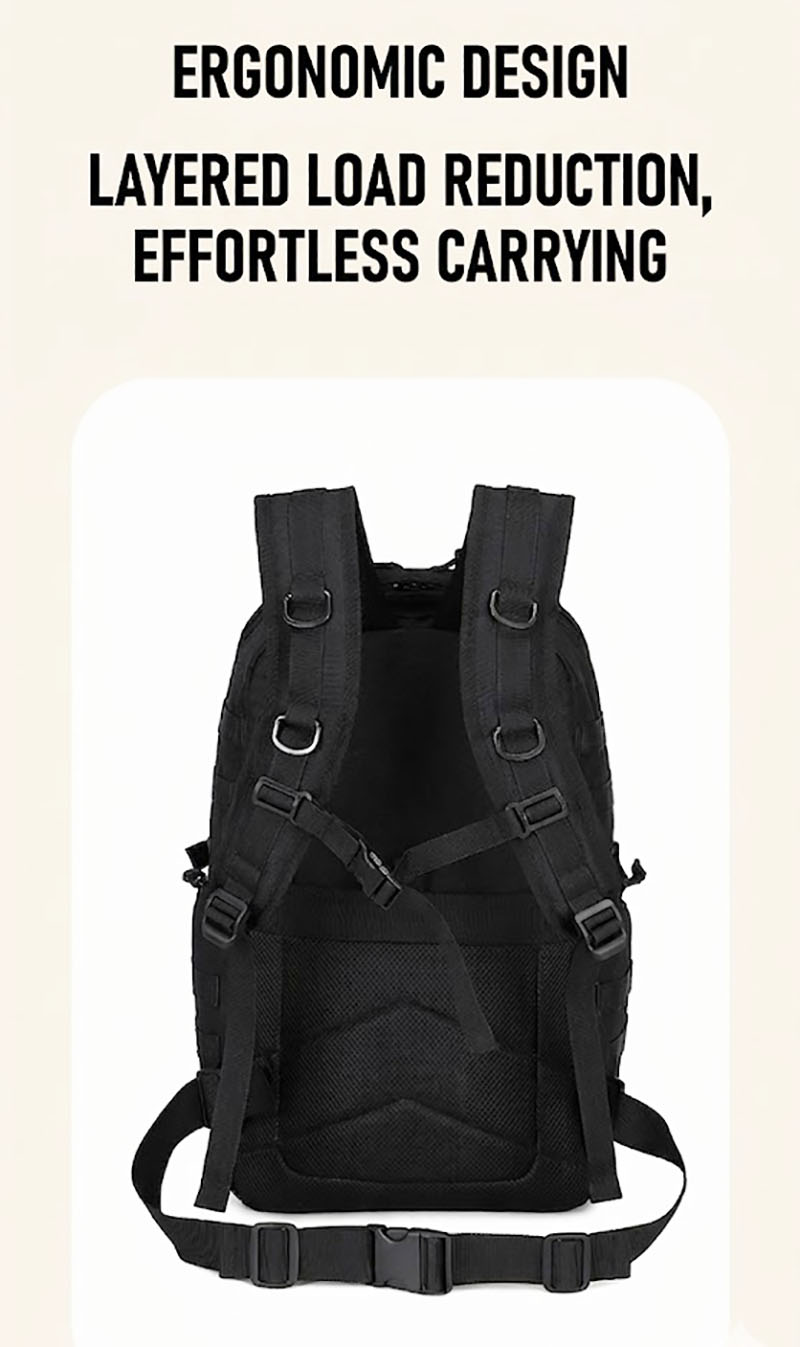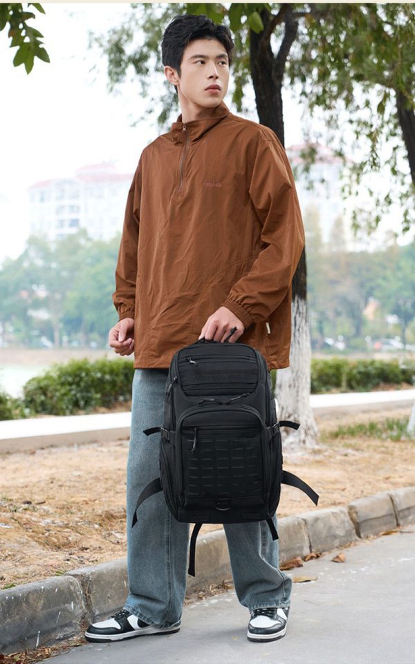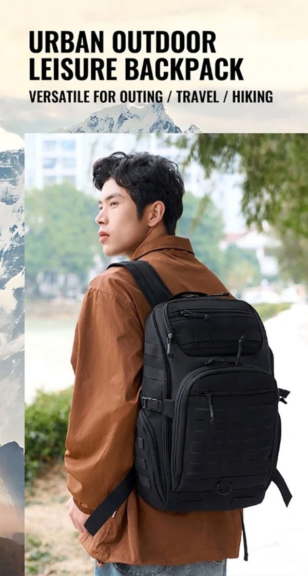1. Clean Outdoor Style with Everyday Versatility This backpack combines a simple black exterior with a structured, outdoors-ready silhouette that looks practical without feeling bulky. The design works well for travel, casual city use, light hiking, and daily carry, while the tactical-style front webbing and utility details add a more rugged character for customers who like gear with a tactical influence.
