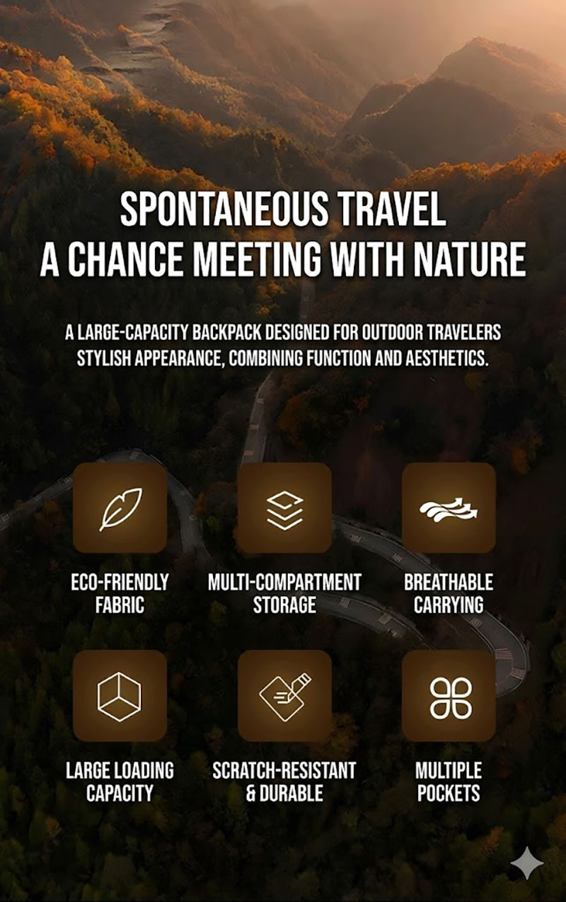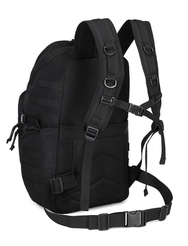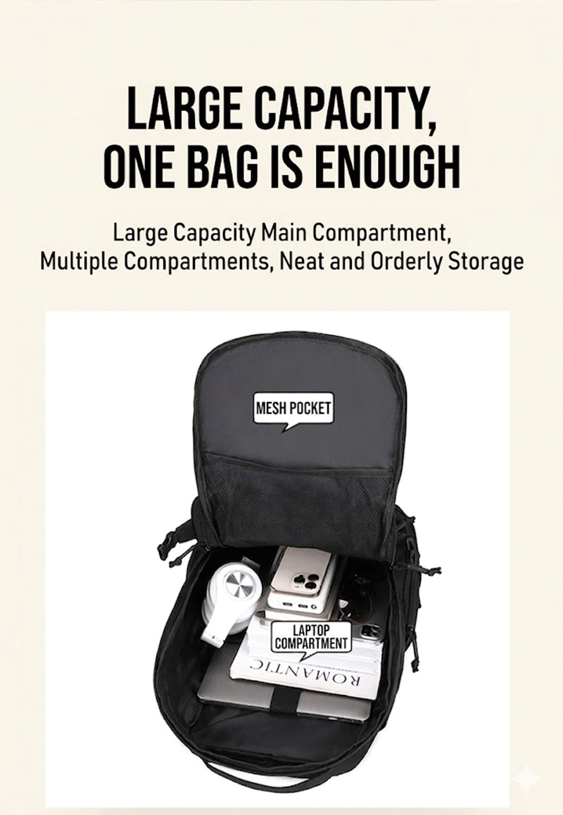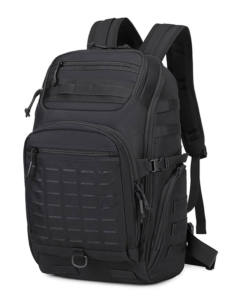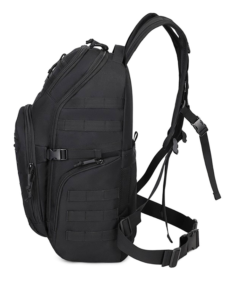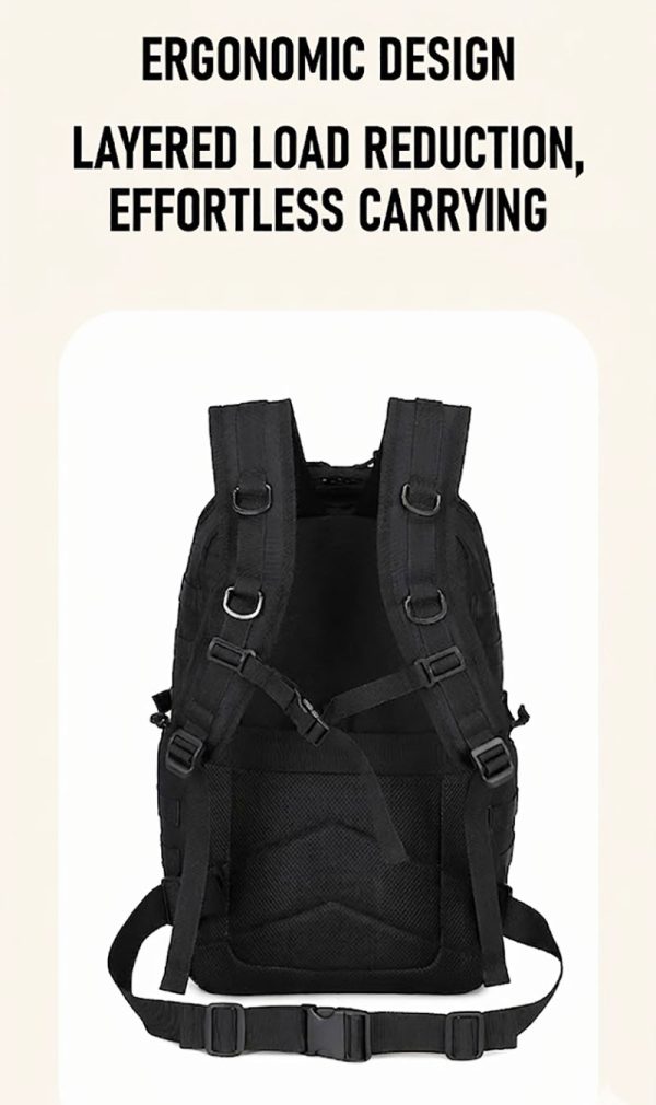 1. Clean Outdoor Style with Everyday Versatility This backpack combines a simple black exterior with a structured, outdoors-ready silhouette that looks practical without feeling bulky. The design works well for travel, casual city use, light hiking, and daily carry, while the tactical-style front webbing and utility details add a more rugged character for customers who like gear with a tactical influence.