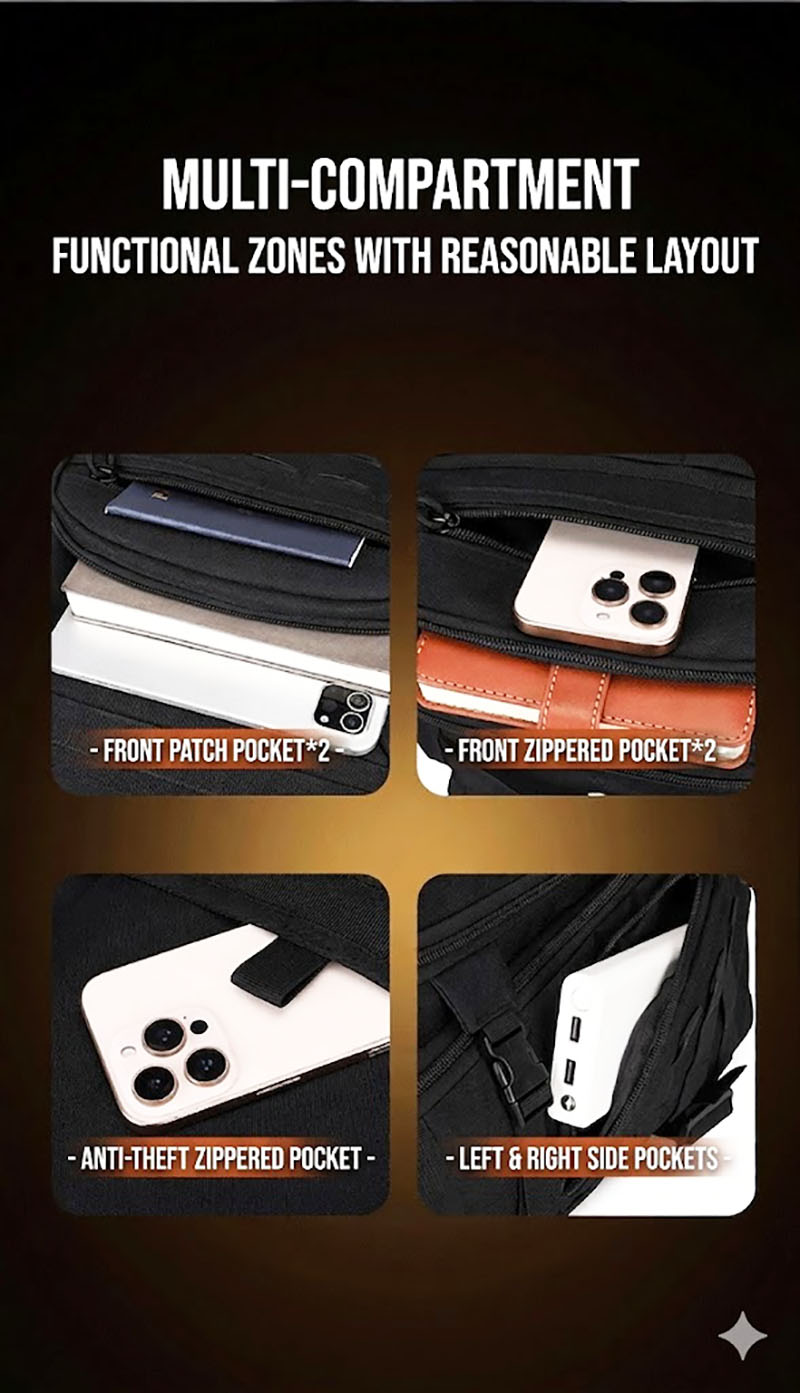 2. Organized Storage for Daily Essentials The bag is built with a large main compartment and multiple front and side storage areas, helping you separate essentials instead of stacking everything in one space. It is suitable for carrying common daily items such as a phone, wallet, charger, notebook, small accessories, and other personal gear needed for work, short trips, or outdoor use.