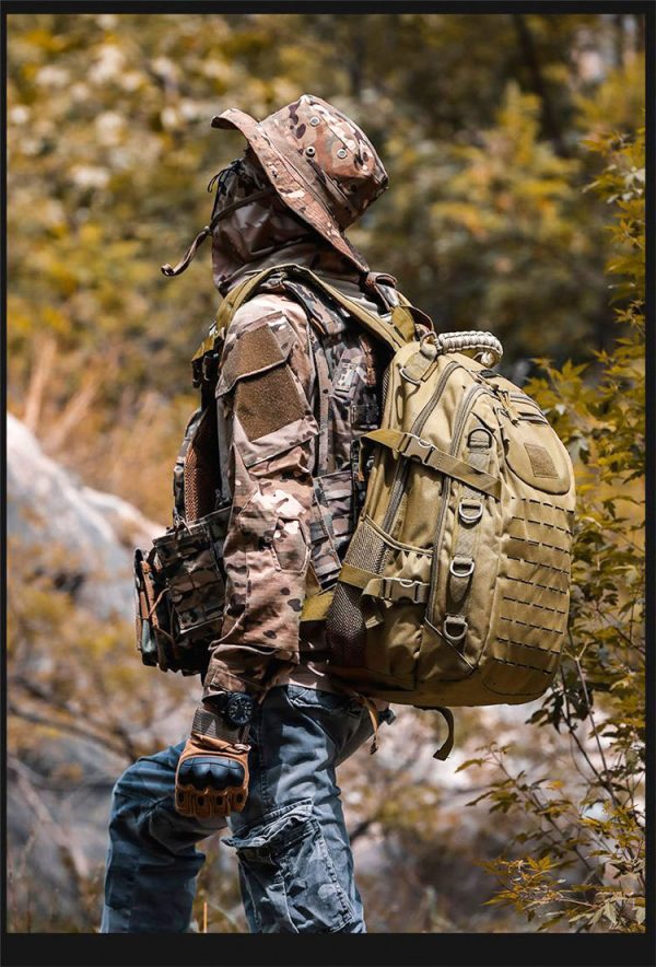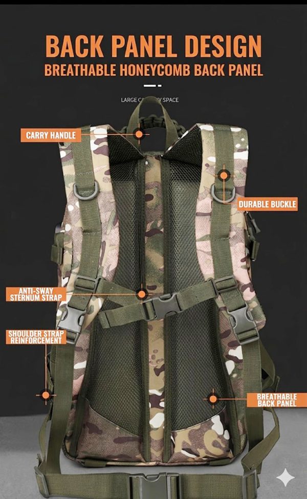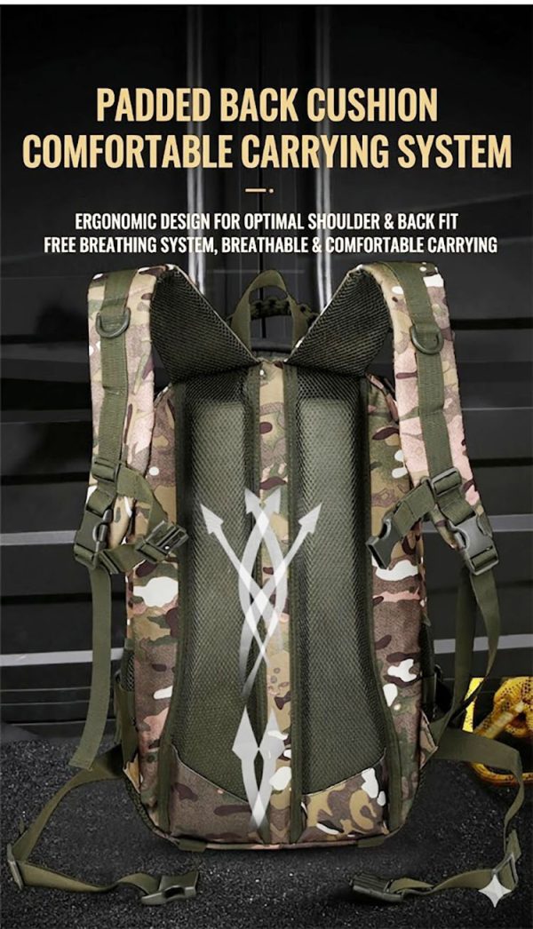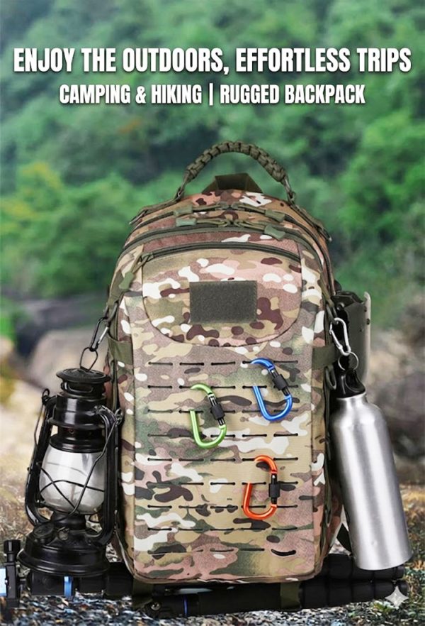 - Tactical-style camouflage backpack for commuting, day trips, and casual outdoor use