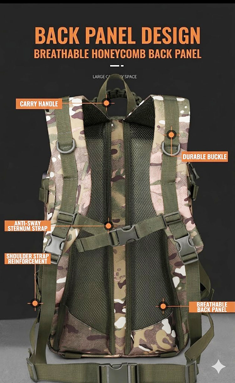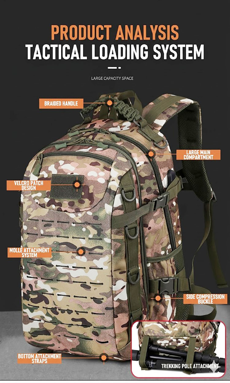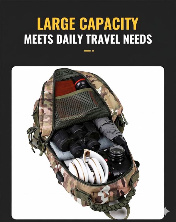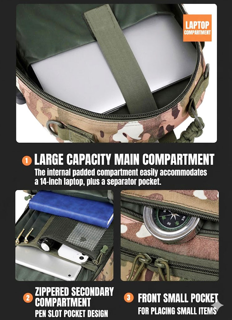 Camouflage Design with Functional Structure The camouflage exterior gives the bag a strong outdoor character, while the front layout is designed for useful organization. The overall structure appears streamlined and balanced, making it easy to carry whether you are heading to work, moving around the city, or packing for a short outdoor outing. For customers who enjoy tactical-inspired gear, this design brings a confident field-ready style in a more practical everyday format.