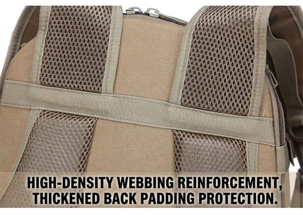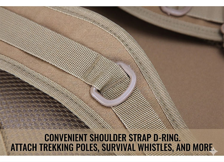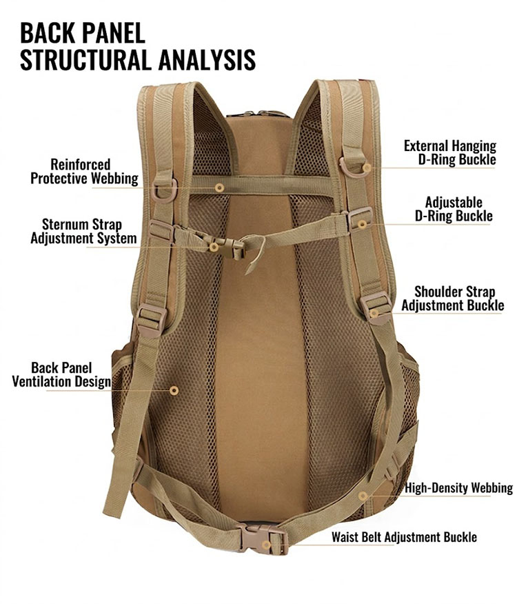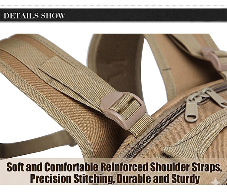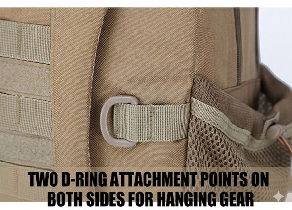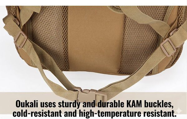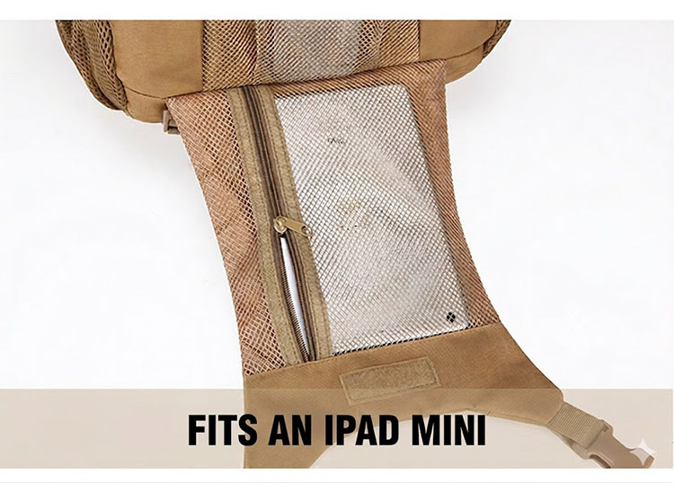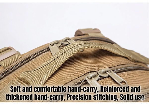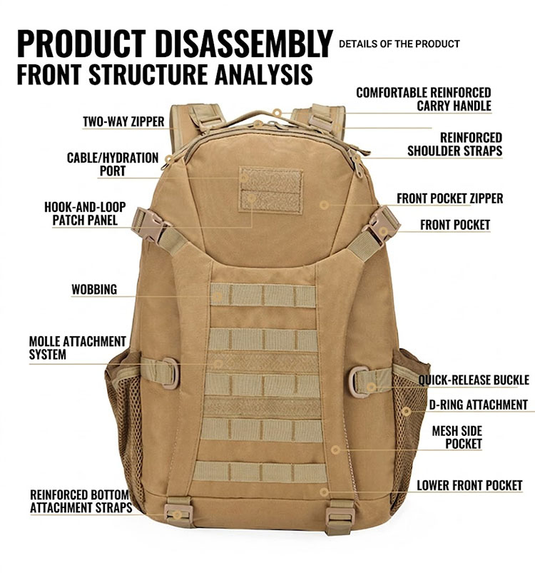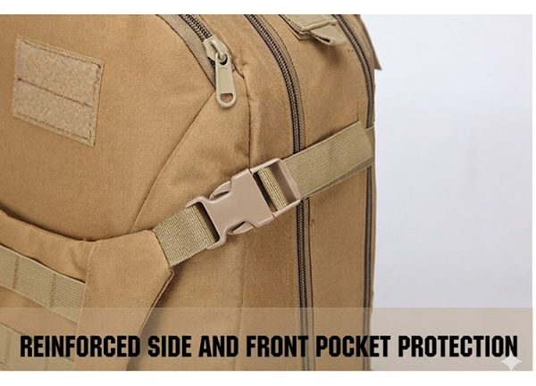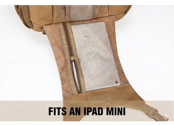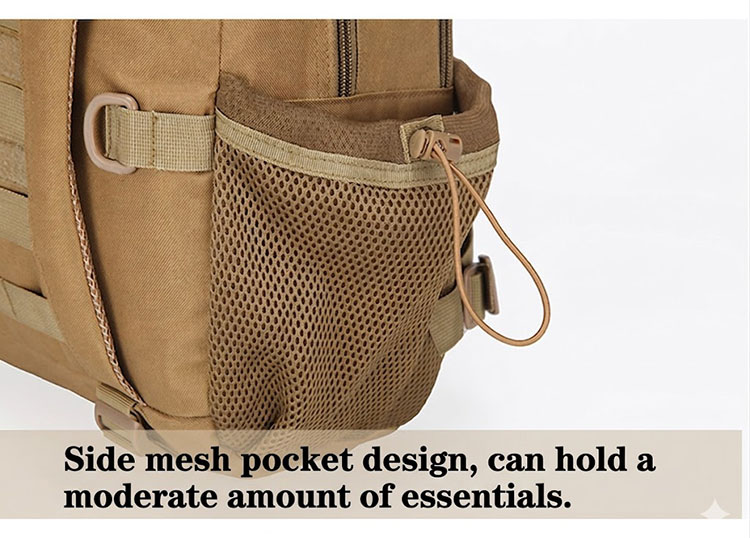 Oxford Fabric Build and Durable Details The bag features an Oxford cloth construction that gives it a firm, dependable feel for regular use. The stitching, reinforced carry points, and strong buckle details help support daily handling, while the tactical-style webbing and front panel layout add extra utility. The design also includes side mesh pockets and attachment points that make the bag more versatile for active users.