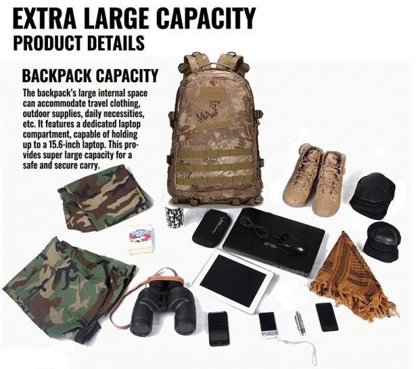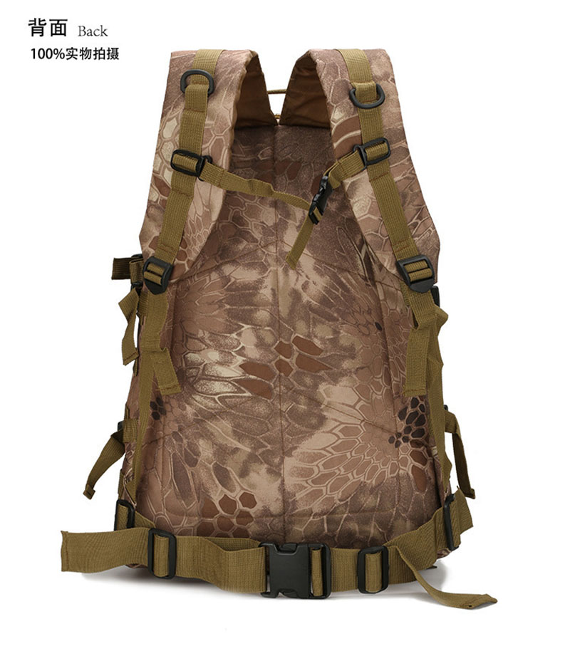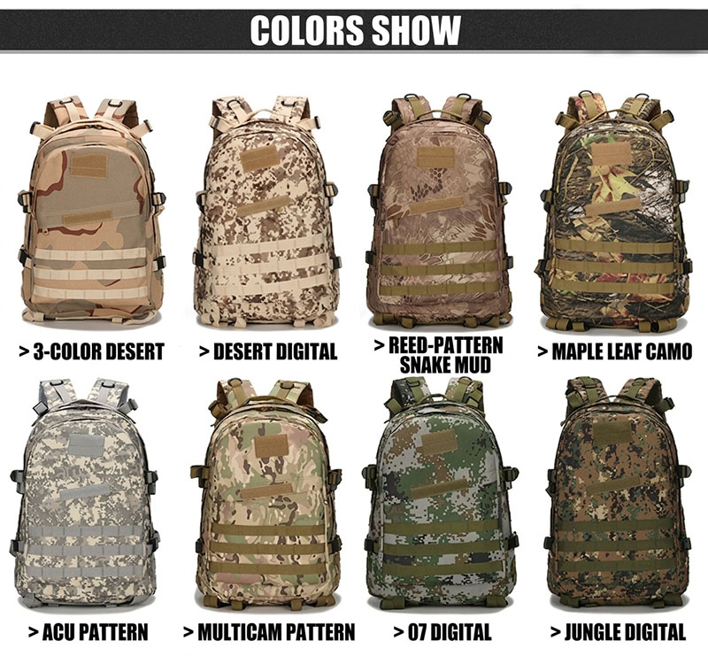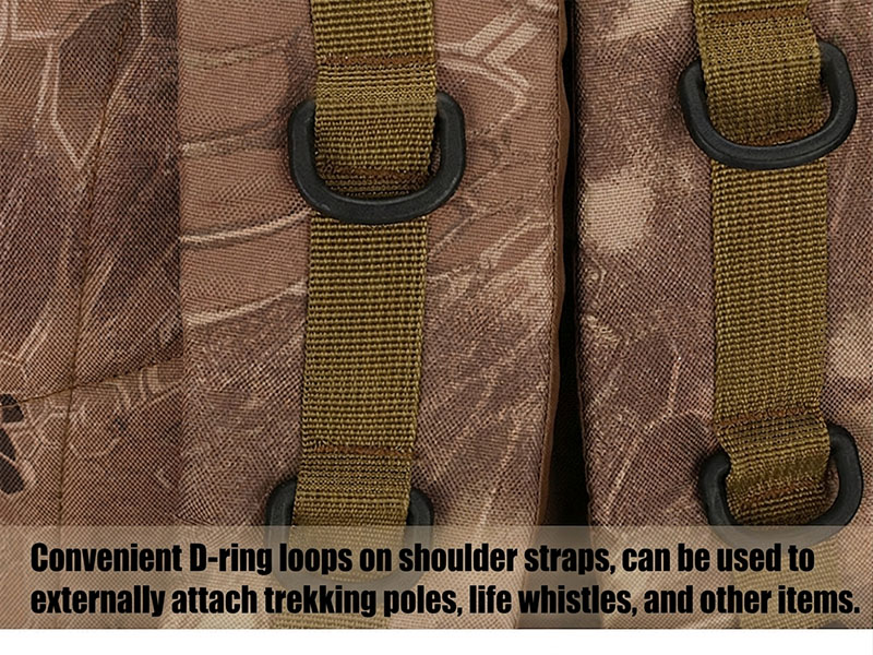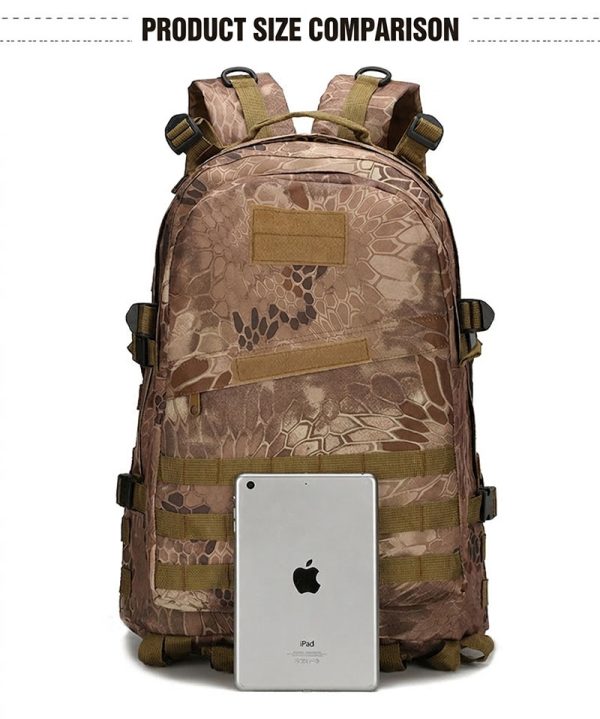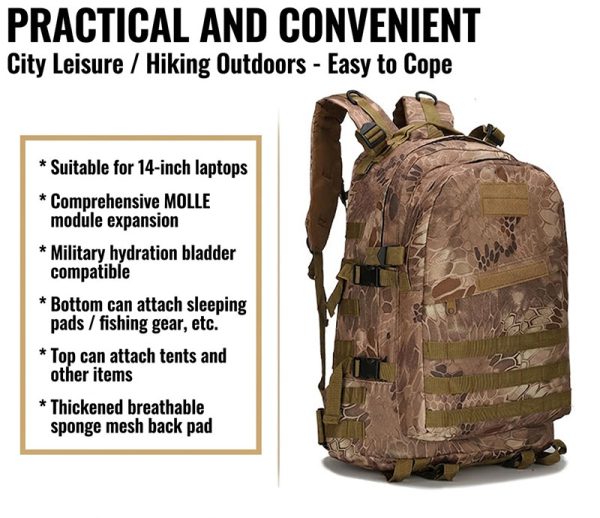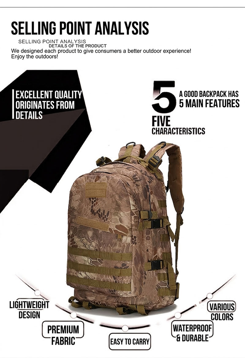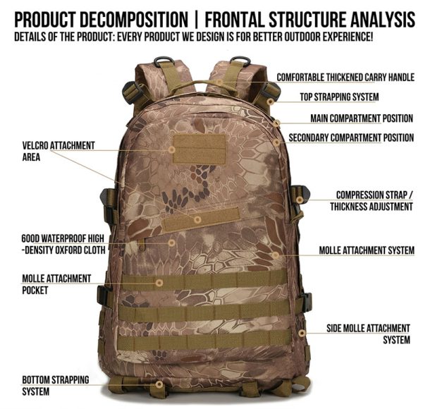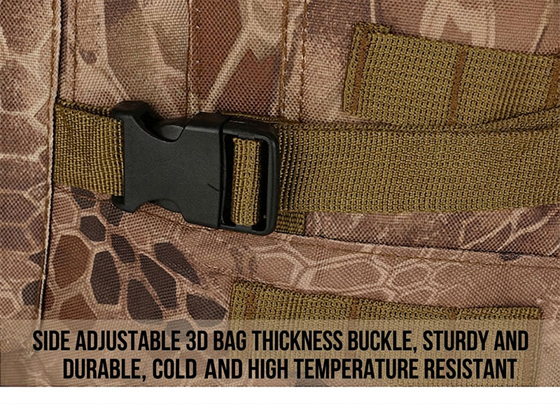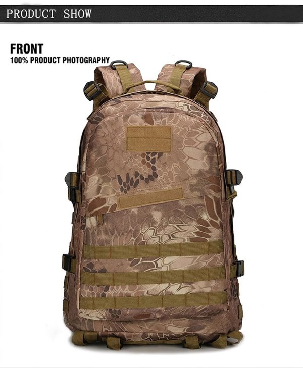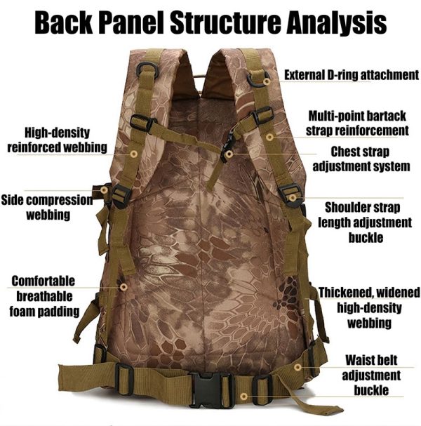 2. Practical Camouflage Design The camouflage finish gives this backpack a rugged outdoor look, while the front panel keeps a clean structured shape that is easy to match with tactical clothing, outdoor wear, and casual street outfits. It feels especially suitable for customers who like military-inspired gear and want a bag that stands out without being flashy.