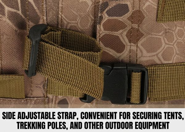 4. Tactical Details That Add Function MOLLE-style webbing on the exterior gives BP09 a more functional feel and allows extra flexibility for attaching compatible pouches or accessories. The adjustable side straps, reinforced handle, secure buckle details, and sturdy zipper construction all support a more reliable carry experience for active users.