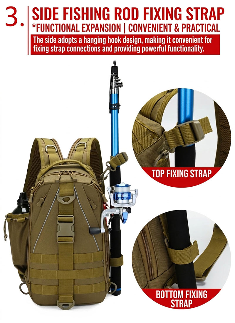 Fishing-Friendly Functional Details Several details make this bag especially useful for fishing use. The rod-fixing strap, side attachments, and external webbing points help keep gear secure and within reach. You can also clip lightweight items outside the bag when needed, which is practical during short fishing trips, movement along riverbanks, or quick setup changes.