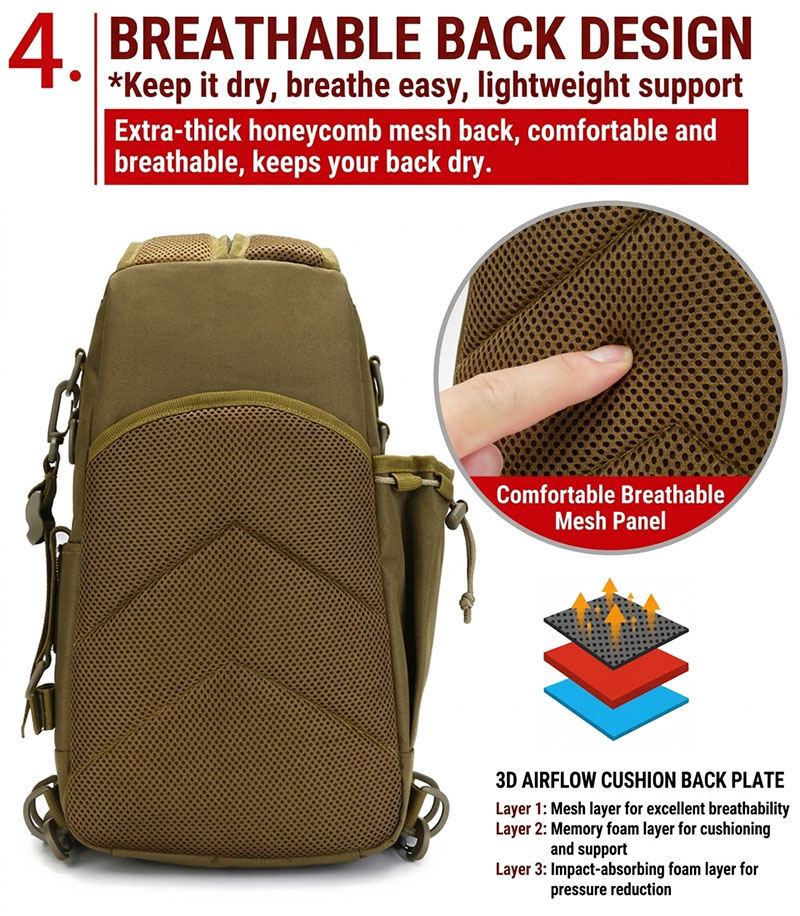 Comfortable for Cambodia’s Hot and Humid Weather The back panel and shoulder area are designed with comfort in mind, including a breathable structure that can feel more manageable during warm outdoor use. For customers in Cambodia, this matters because daily conditions are often hot and humid. A bag that sits close to the body still needs airflow and a stable carry feel, especially for walking, commuting, and outdoor activity under the sun.