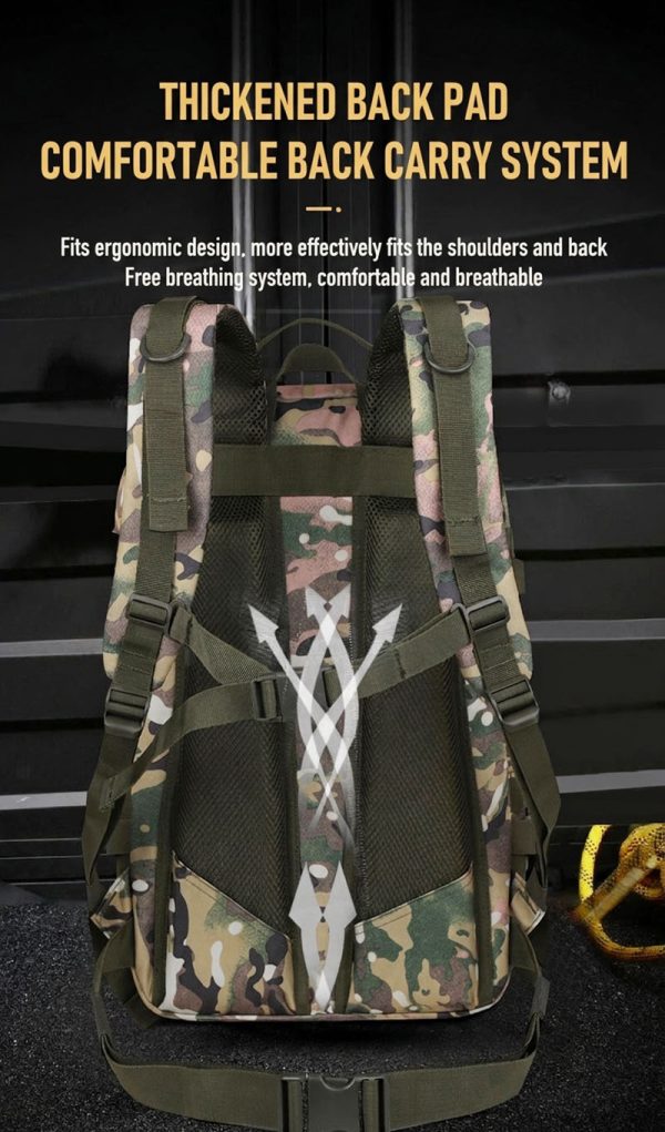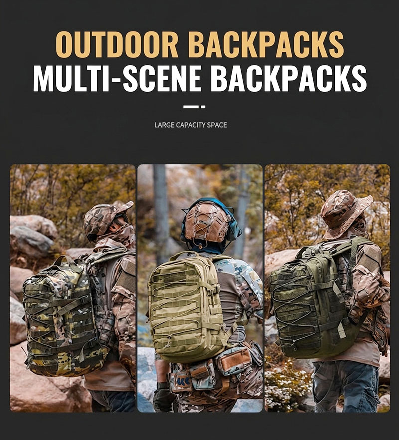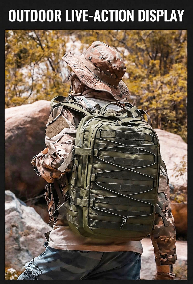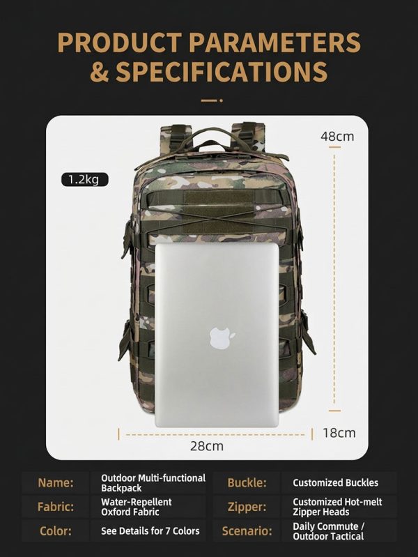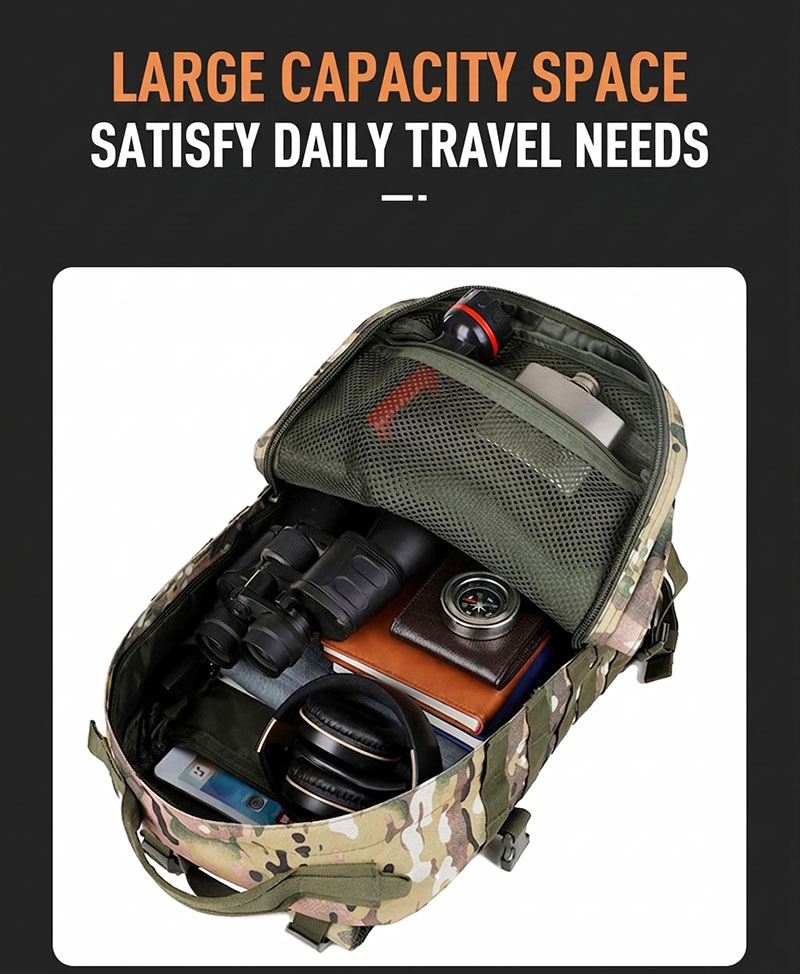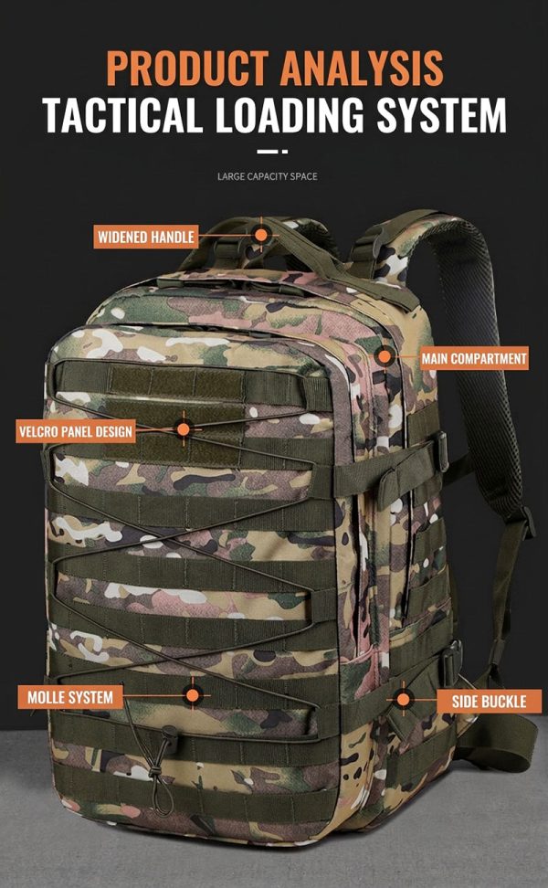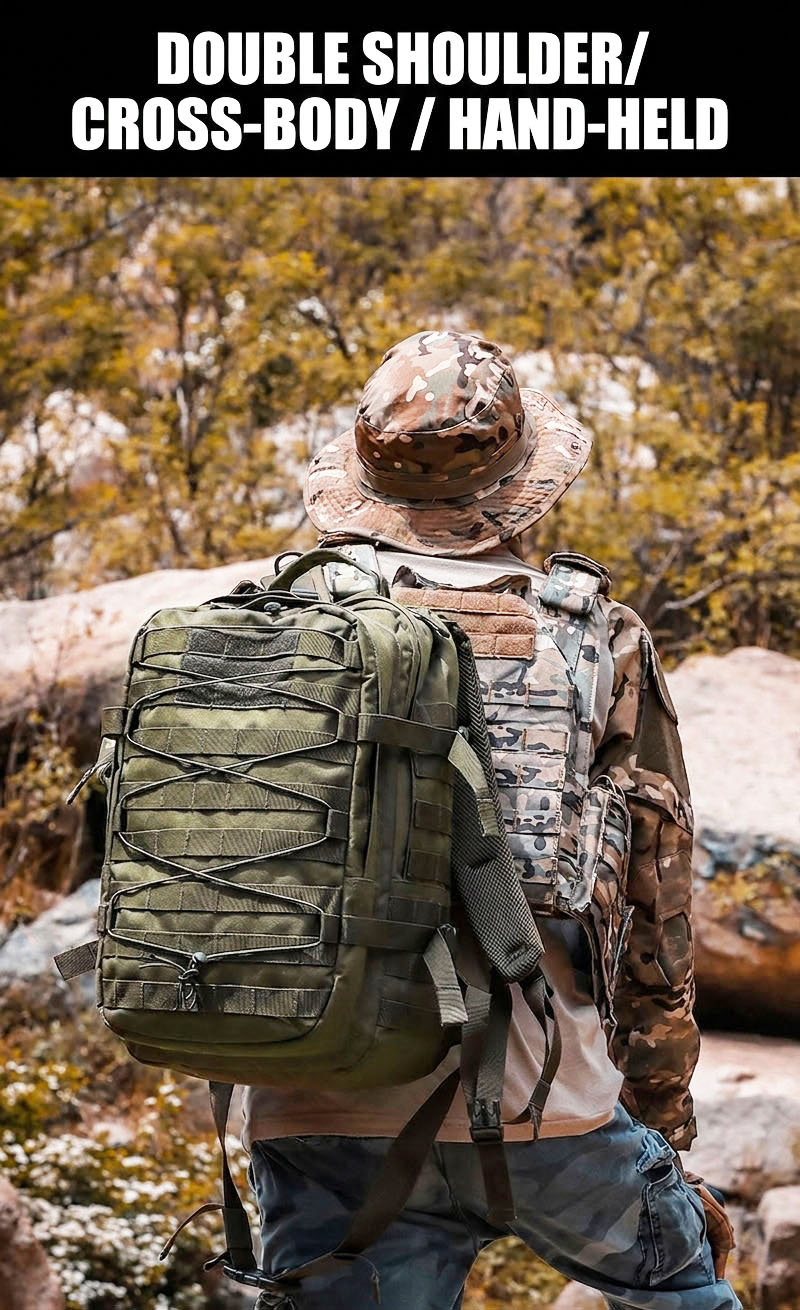 Built for Practical Outdoor Use This backpack is designed for people who need one bag that can move easily between daily routines and outdoor plans. The overall shape is structured and spacious, making it suitable for commuting, day trips, light hiking, camping, and general travel. Its tactical-inspired look gives it a strong, capable presence without sacrificing everyday usability.
