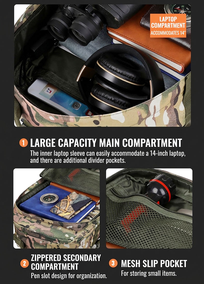 Large-Capacity Storage Layout The bag features a roomy main compartment supported by multiple layered storage sections for better organization. This makes it easier to separate clothing, accessories, small tools, charging items, and daily essentials instead of placing everything into one open space. For customers who prefer a backpack that helps keep gear arranged and easy to reach, this layout offers clear everyday convenience.