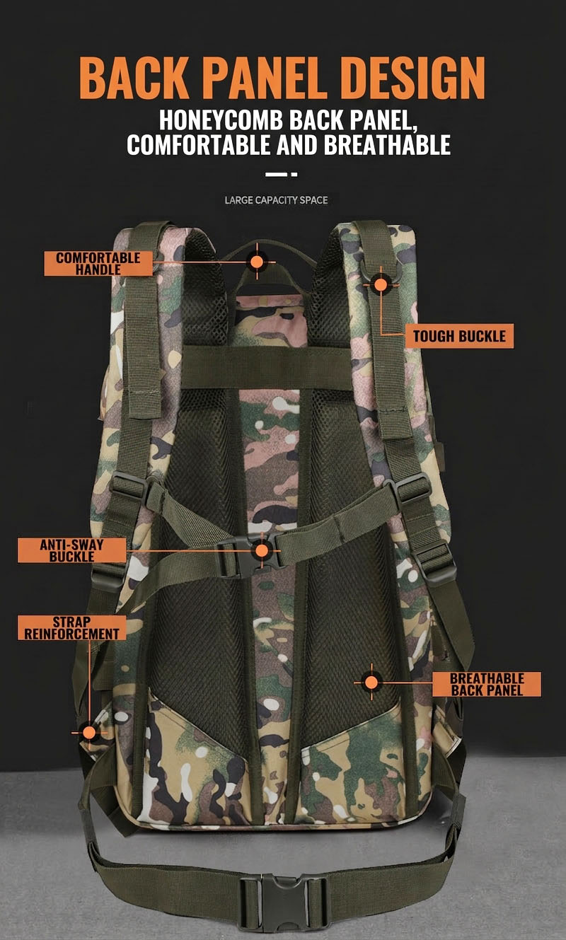 Suitable for Cambodia For customers in Cambodia, this backpack works well for mixed-use lifestyles – city commuting, campus use, short travel, outdoor excursions, and weekend activities. Its large internal space and easy-carry format make it useful for carrying extra items during long days out, while the rugged look pairs naturally with outdoor clothing, tactical-inspired outfits, and casual streetwear.