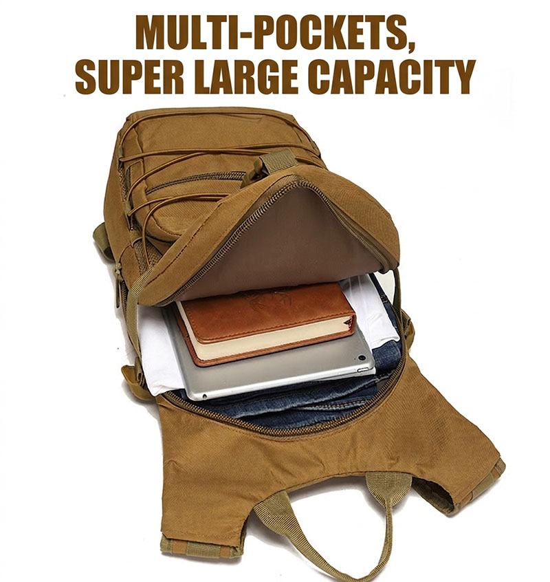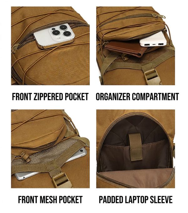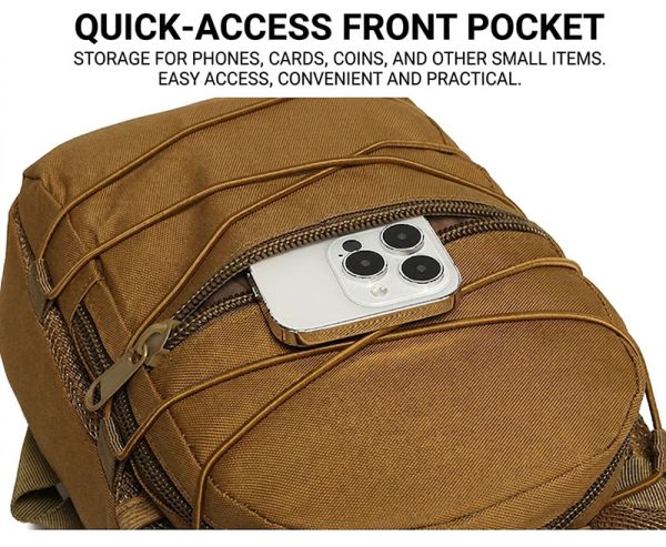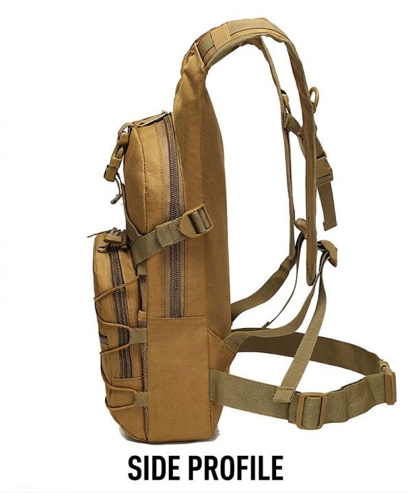 - Compact tactical sling backpack with a slim outdoor-ready shape