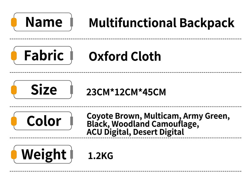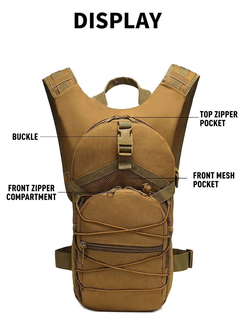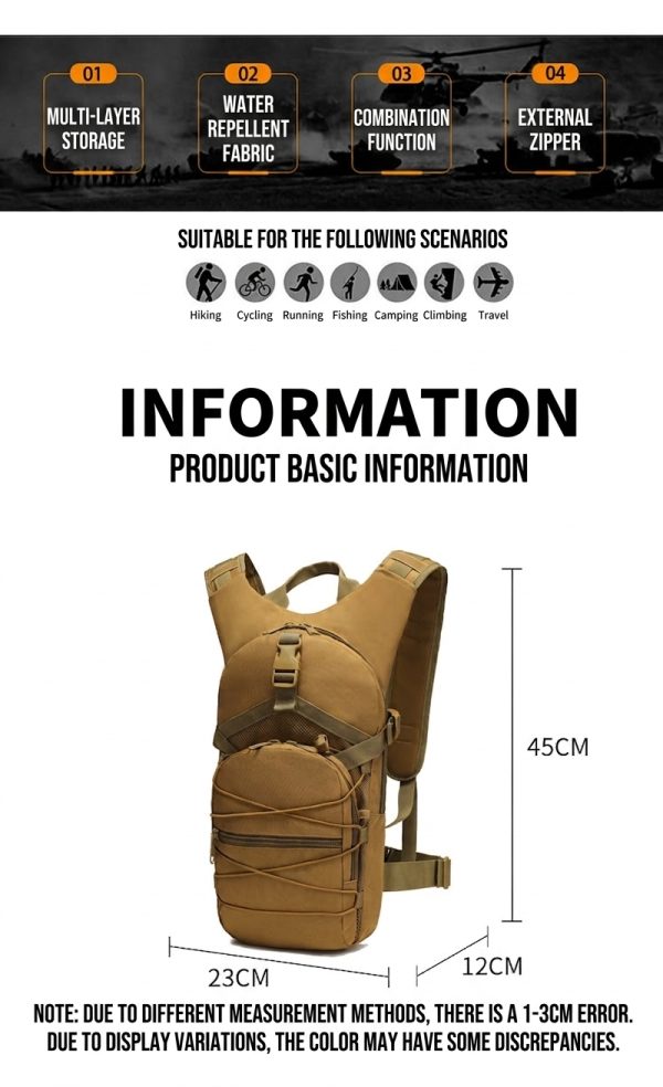 4. Oxford Cloth Construction with Practical Outdoor Appeal The product information shows Oxford cloth construction, which supports the bag’s durable and utility-focused character. Combined with the compact tactical build, it makes BP14 a suitable choice for outdoor walking, short cycling trips, casual travel, and daily use where a lightweight but dependable bag is preferred.