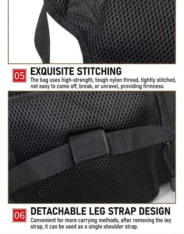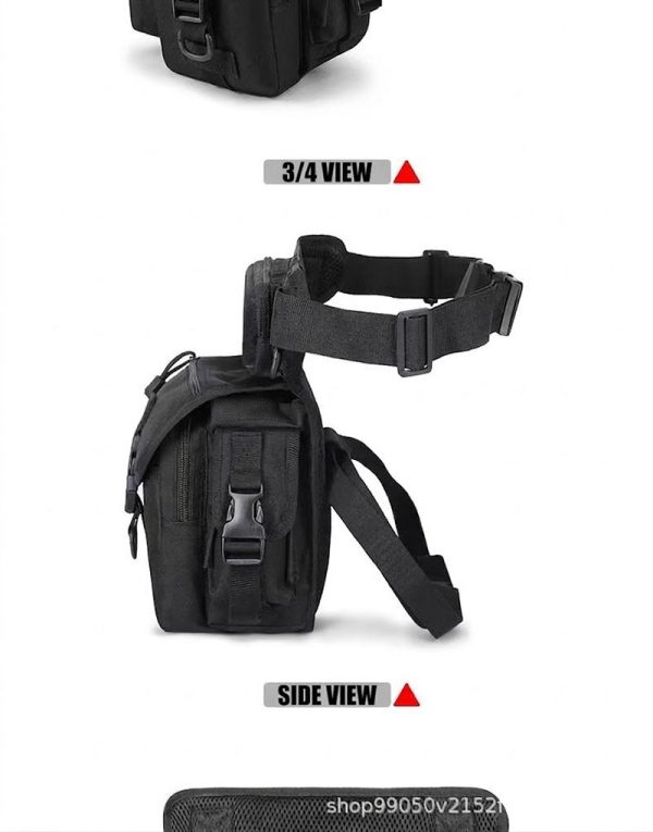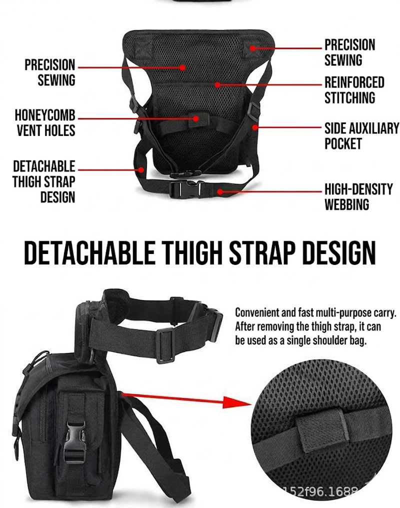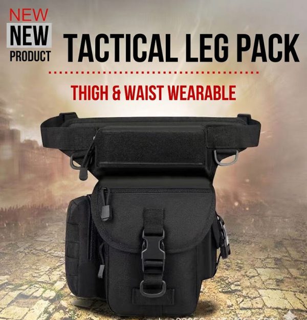 - Tactical drop leg bag design with waist and thigh attachment