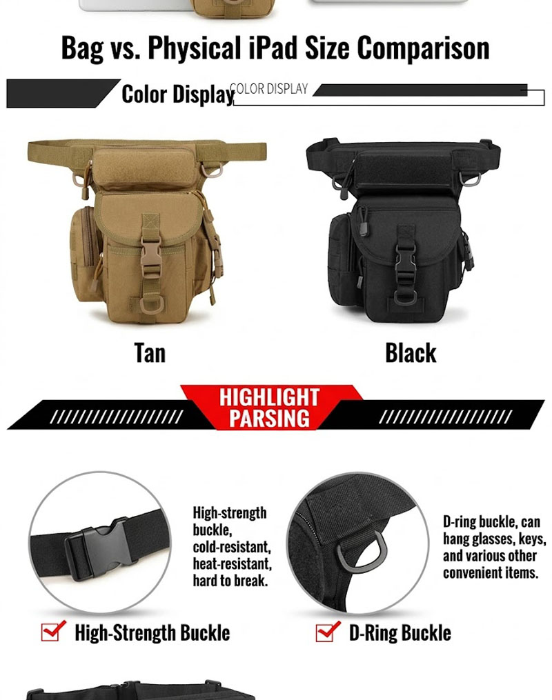 The BG02 tactical drop leg bag is built for users who need compact, body-secured storage for outdoor activities, riding, utility carry, and tactical styling. With multiple zip compartments, adjustable waist and thigh straps, and a rugged field-ready look, it offers practical organization while staying close to the body during movement.