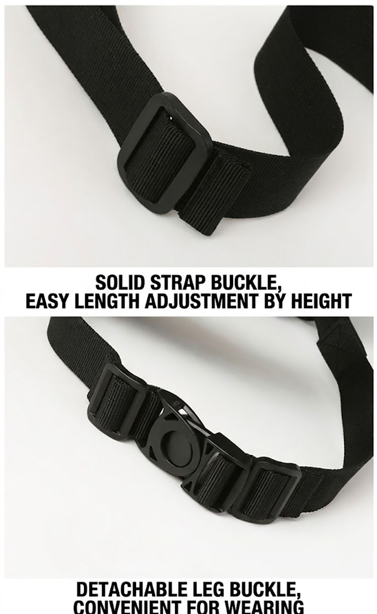 - Adjustable waist strap with detachable leg strap