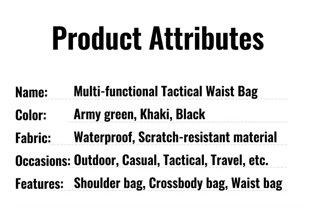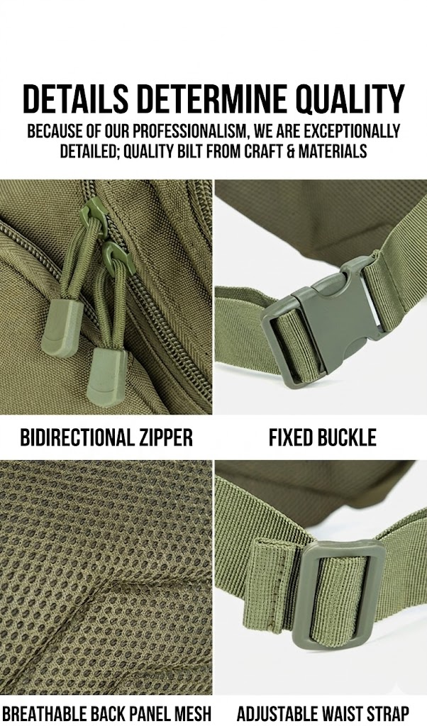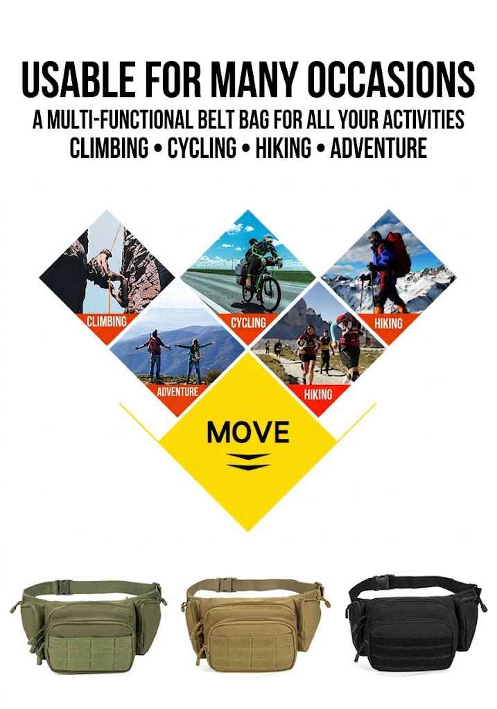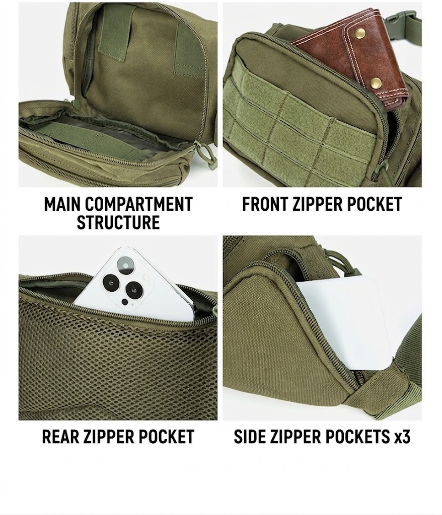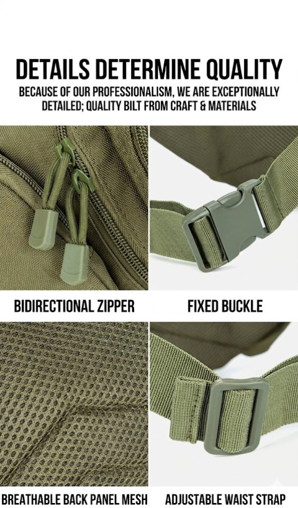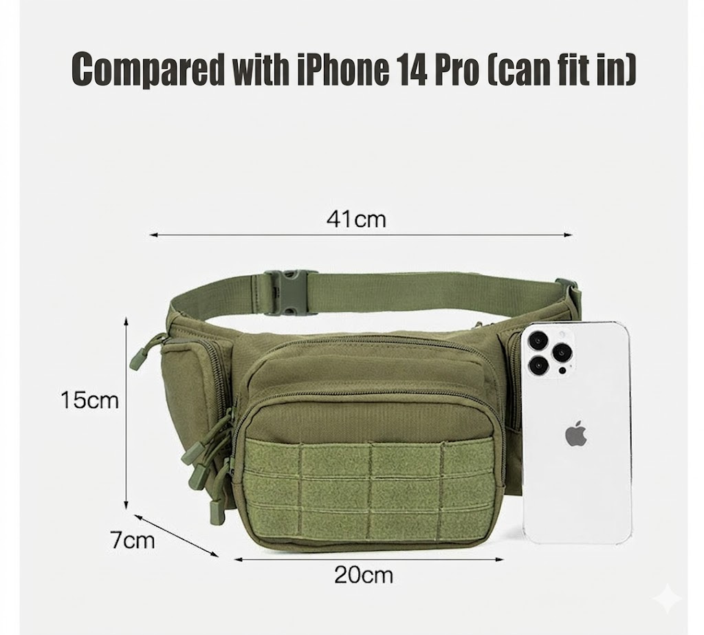 Outdoor-Ready Tactical Style The rugged strap hardware, utility-focused structure, and tactical-inspired styling give BG07 a clean outdoor look that works well with casual clothing, riding gear, and military-inspired everyday fashion. It feels functional enough for active use while still staying simple and easy to match with regular outfits. This makes BG07 a good fit for customers who want a tactical waist bag that looks practical and modern at the same time.