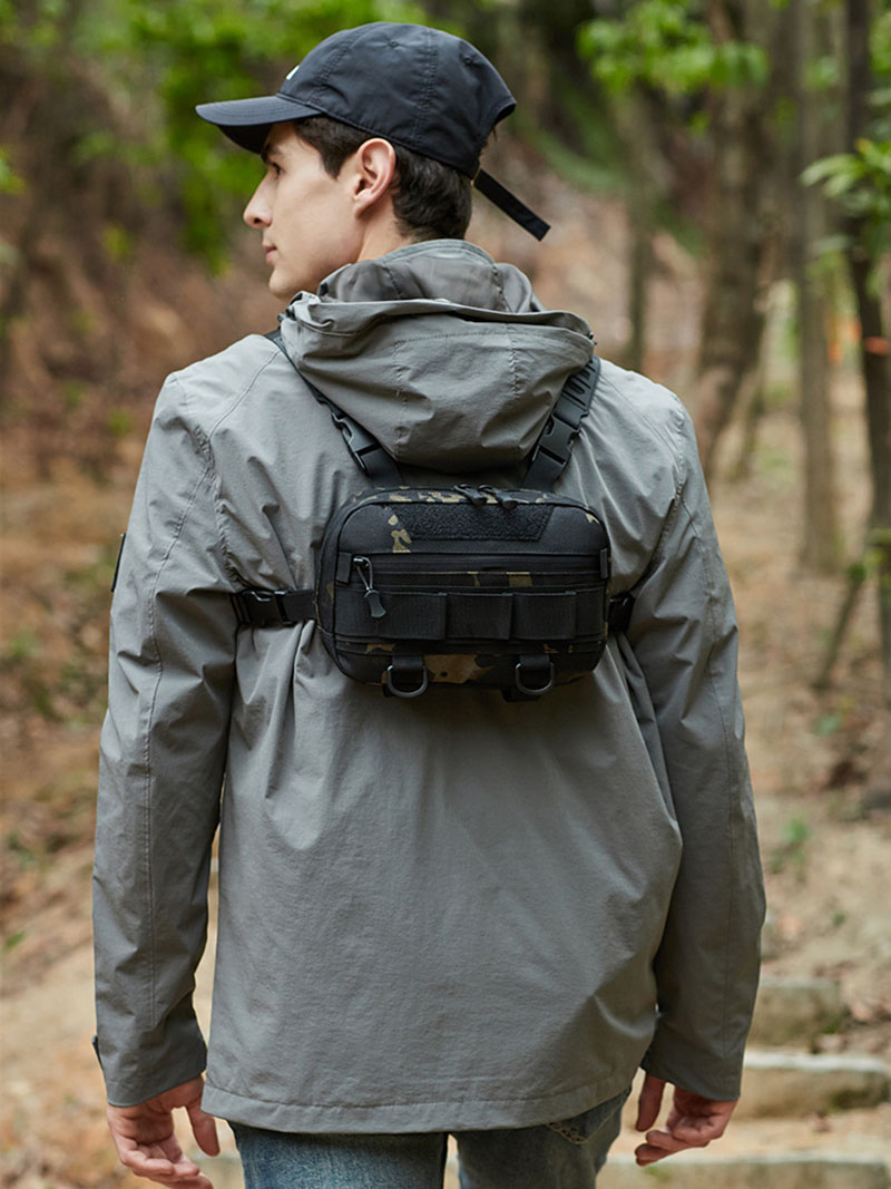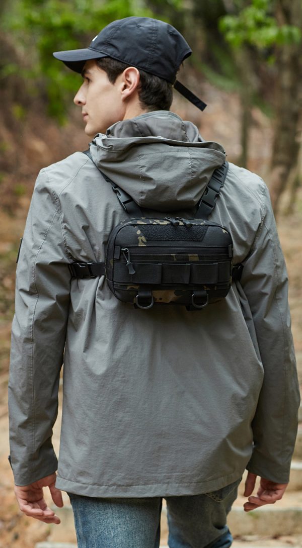 Outdoor Utility with a Clean Tactical Look BG11 combines outdoor practicality with a clean tactical-inspired design. The front loops, structured pockets, and compact chest-pack silhouette give it a more rugged utility character while still keeping the overall style simple and modern. This makes it easy to pair with casual clothing, outdoor wear, travel outfits, and utility-focused everyday styling.