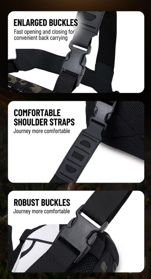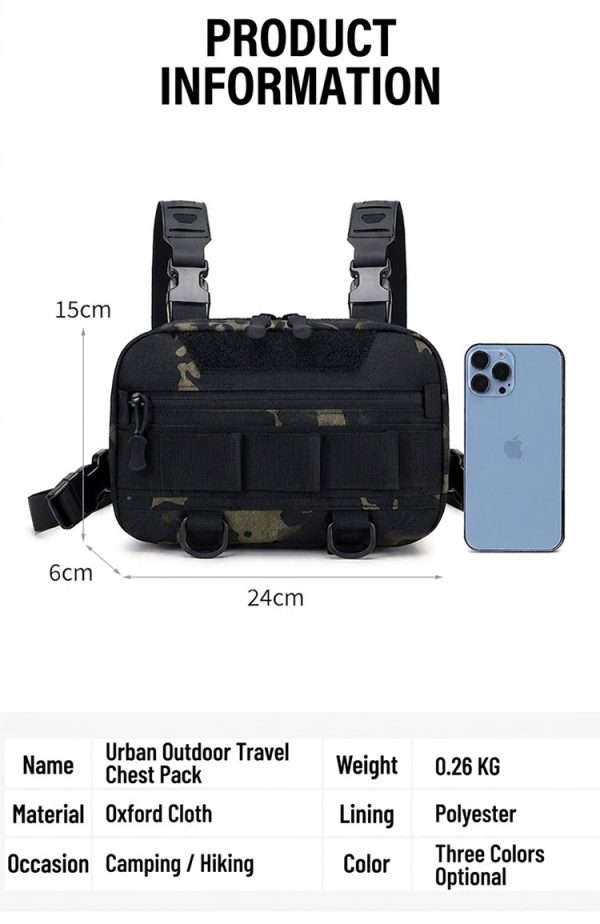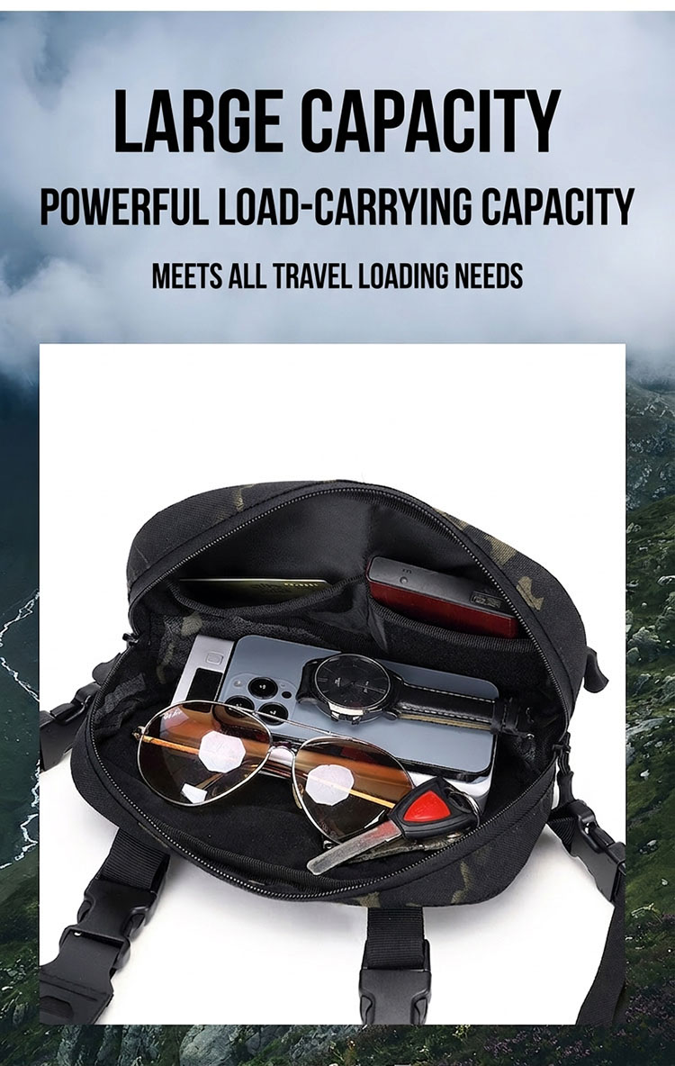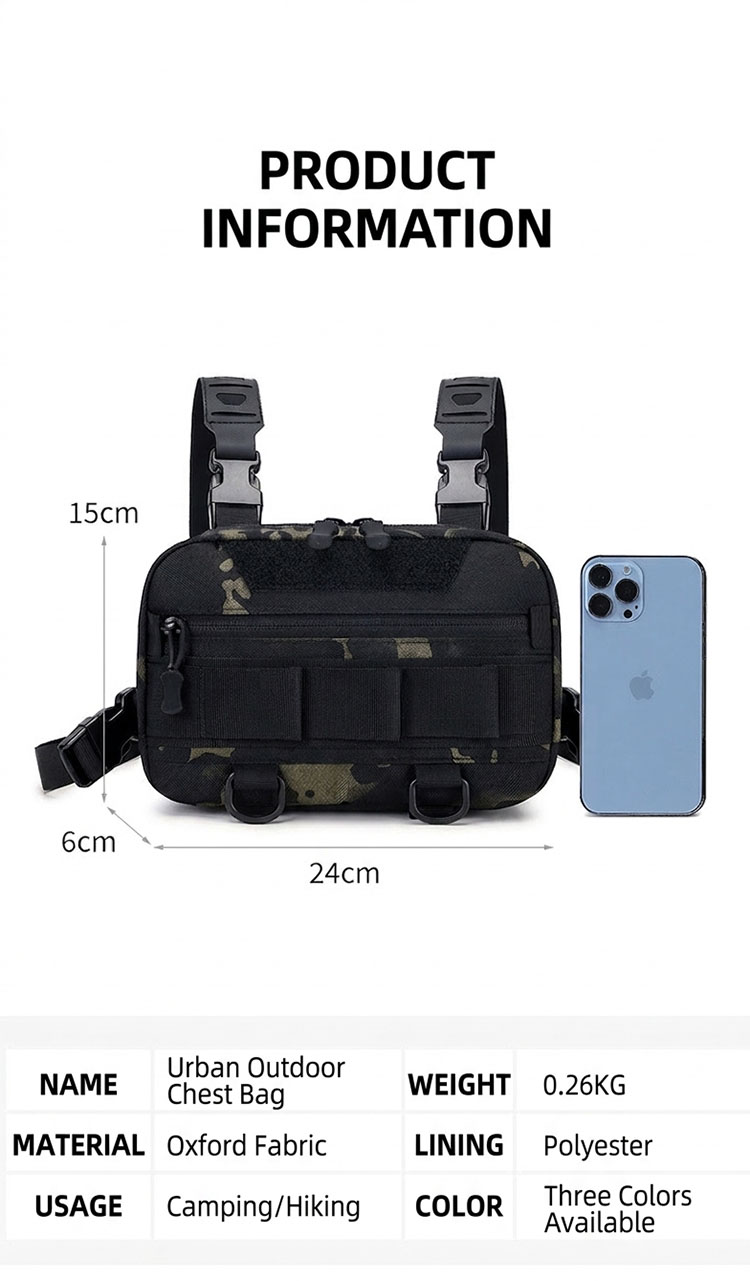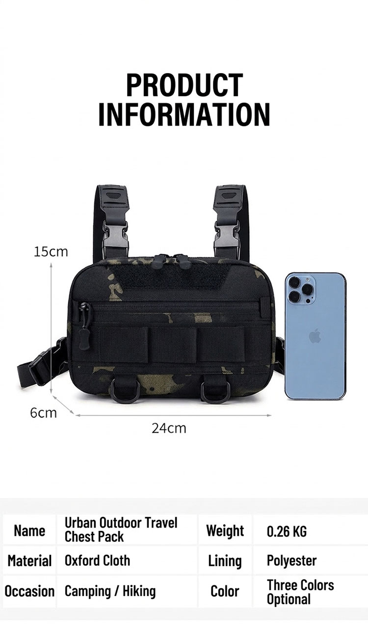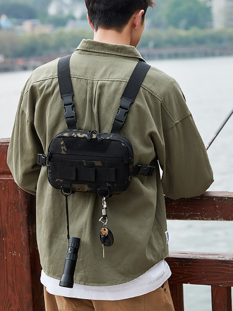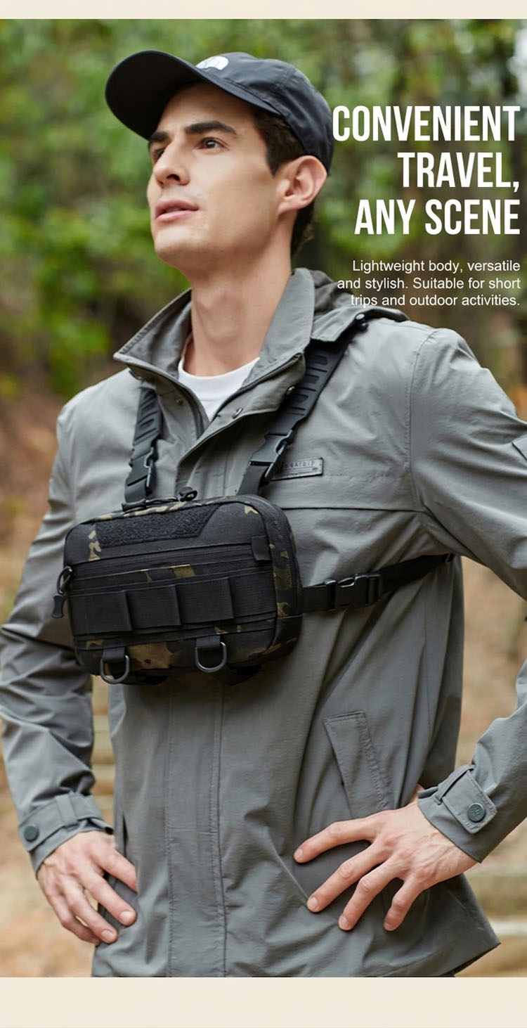 The BG11 chest pack blends lightweight outdoor practicality with a compact tactical-inspired shape. Designed for travel, fishing, hiking, and daily carry, it offers a structured front layout, multiple storage zones, breathable backing, and an easy crossbody fit that keeps essentials close and organized.
