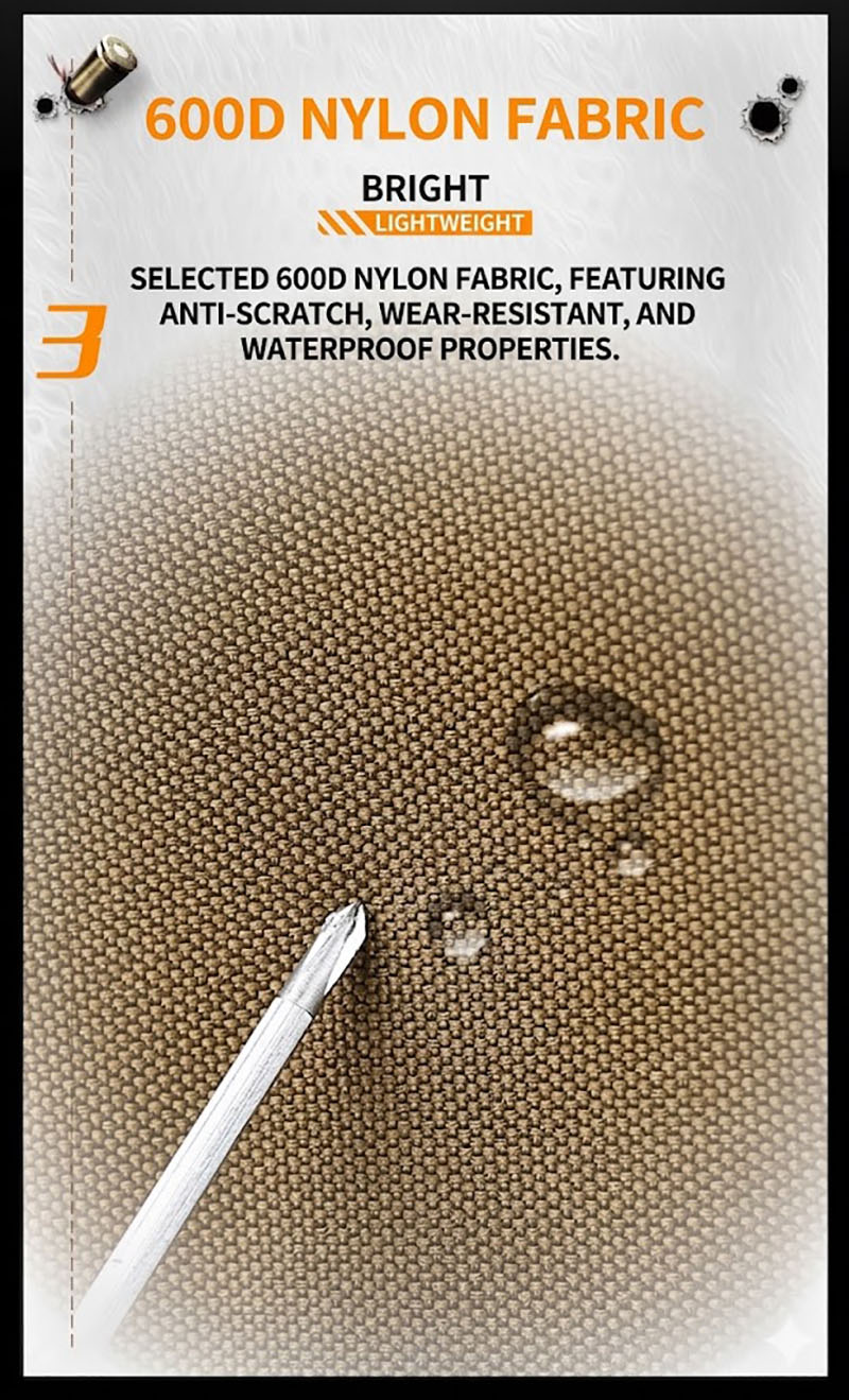 - 600D nylon-style fabric presentation with wear-resistant and water-repellent positioning