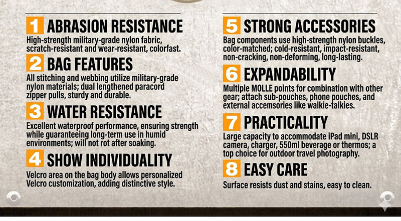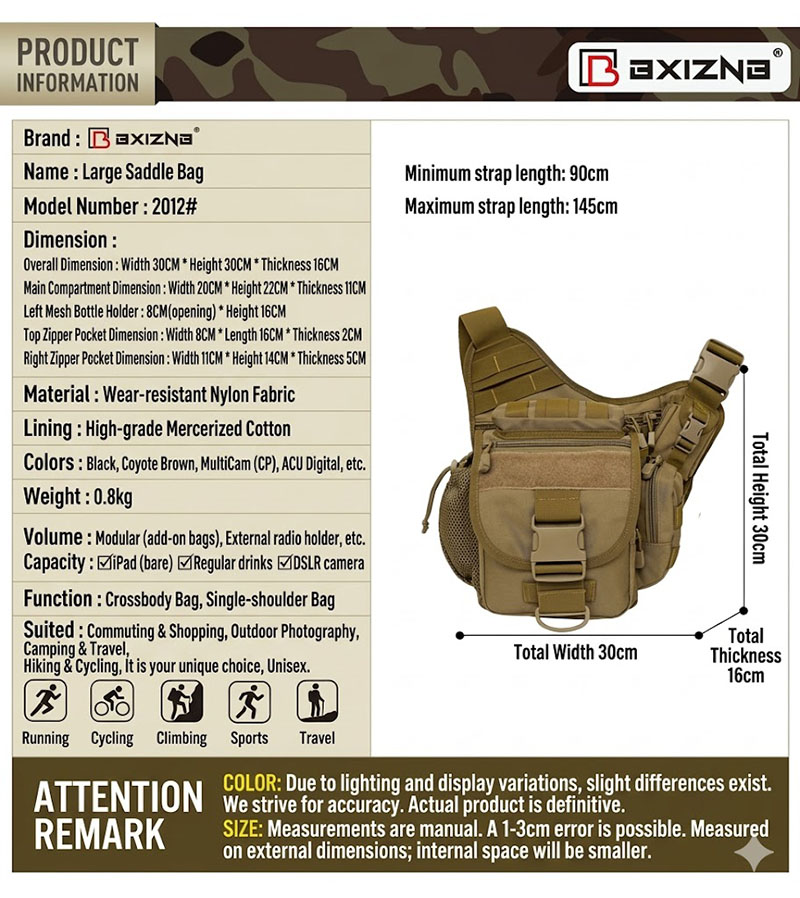 BG35 is a large-capacity outdoor shoulder bag designed for crossbody carry, travel use, and utility-focused organization. With a structured saddle-bag profile, wear-resistant fabric presentation, and multi-functional storage layout, it works well for outdoor activities, photography gear, commuting, and everyday carry.