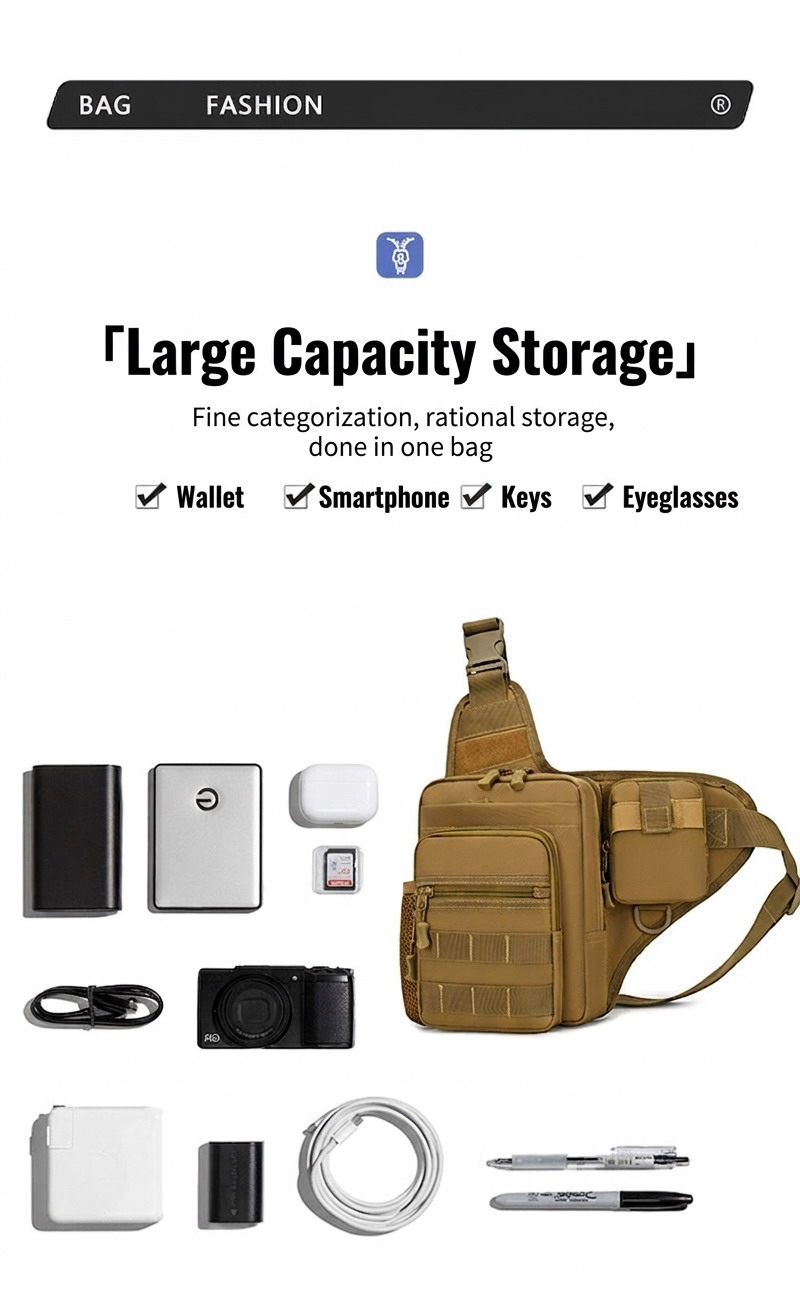 Spacious Storage with Better Daily Organization BG38 offers a roomy multi-compartment layout that helps keep daily essentials more organized and easier to access. Phones, wallets, keys, chargers, cards, power banks, sunglasses, small tools, and outdoor accessories can be arranged more neatly across the visible front and main storage sections. This makes the bag especially practical for customers who want larger daily capacity without losing easy access and compact body carry.