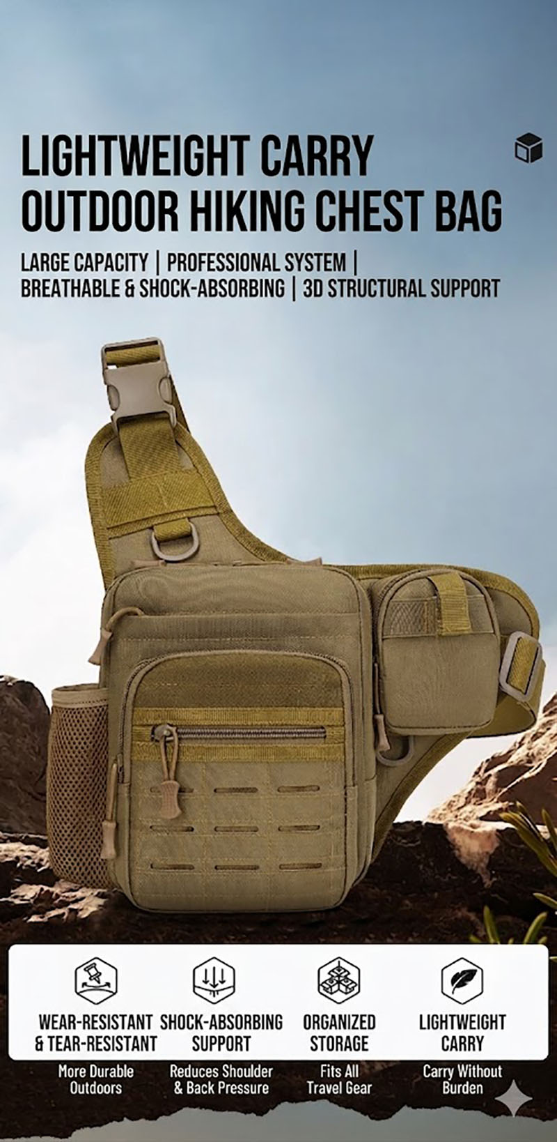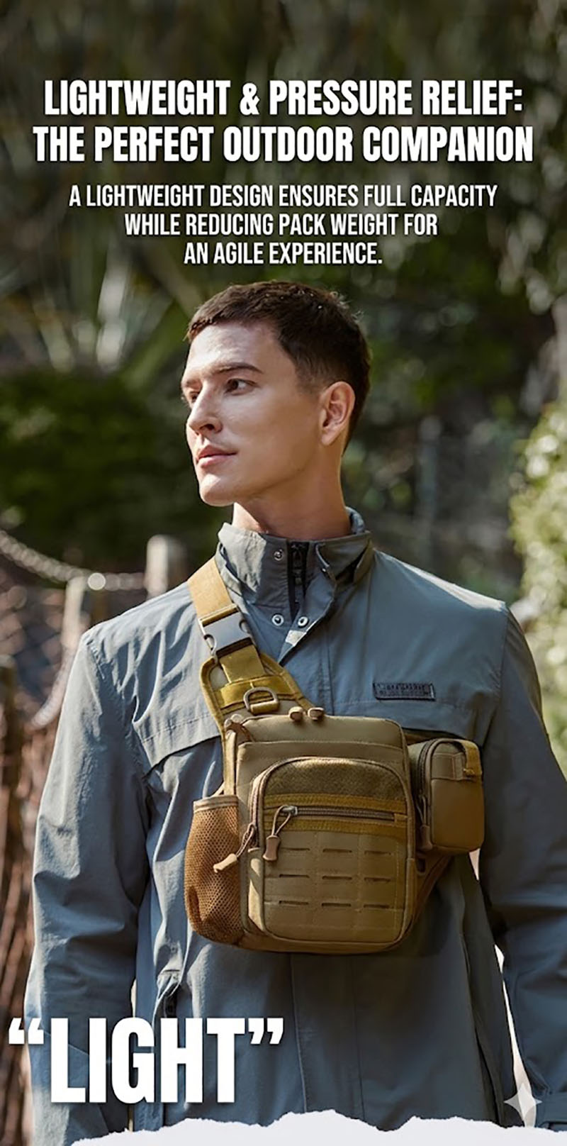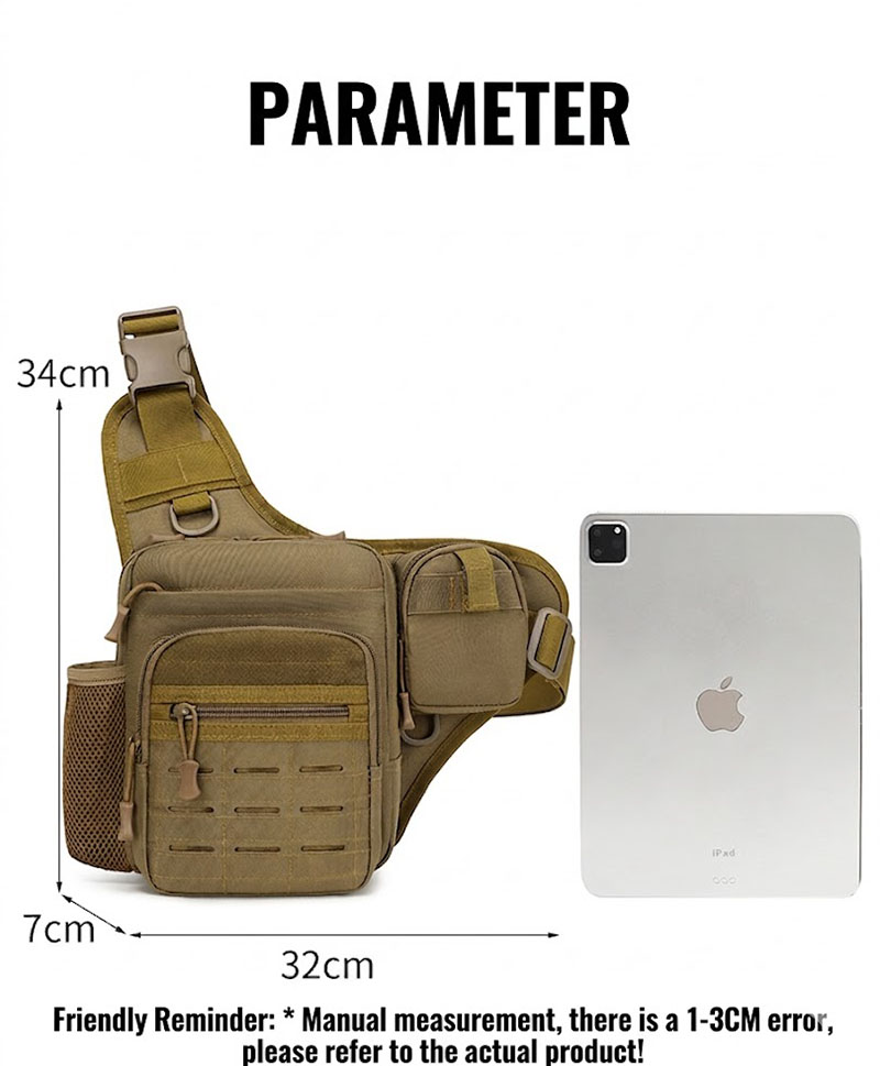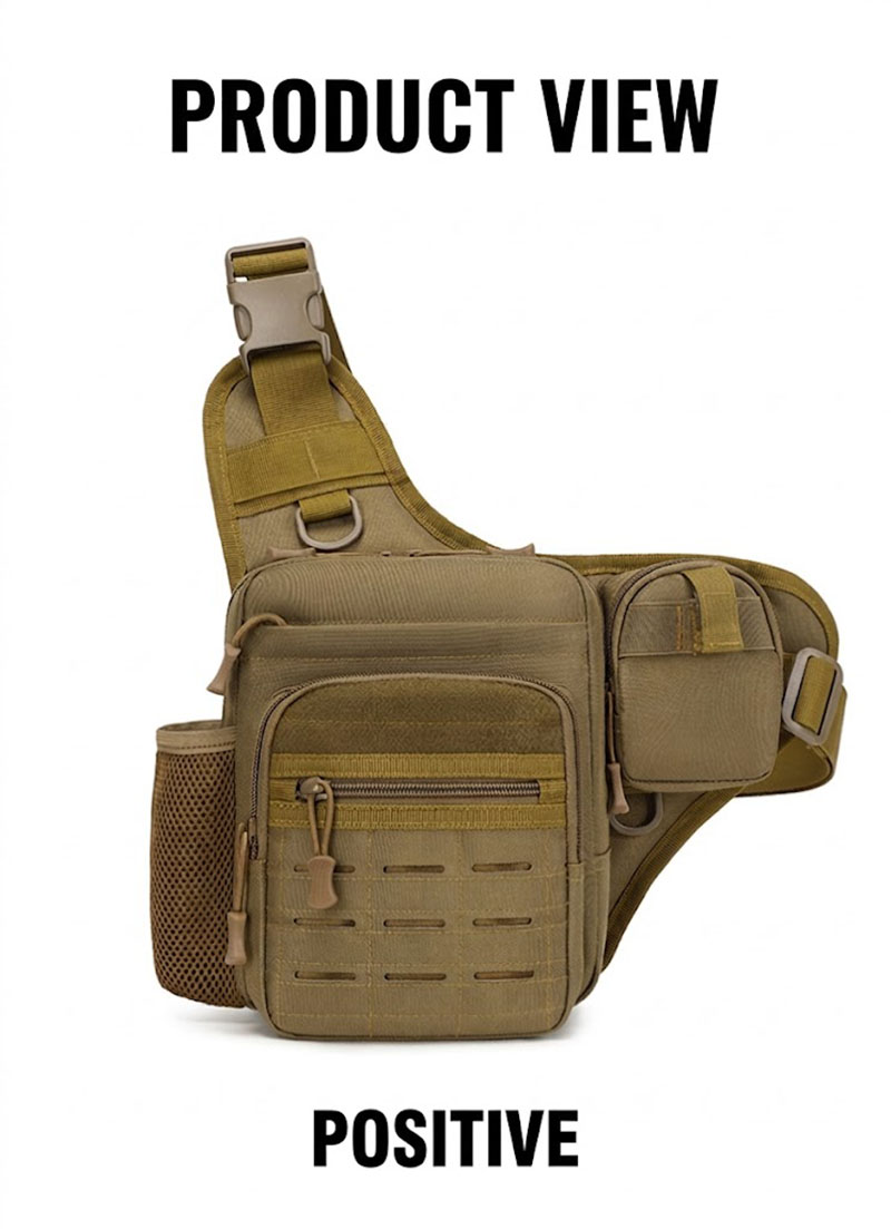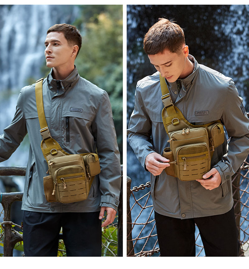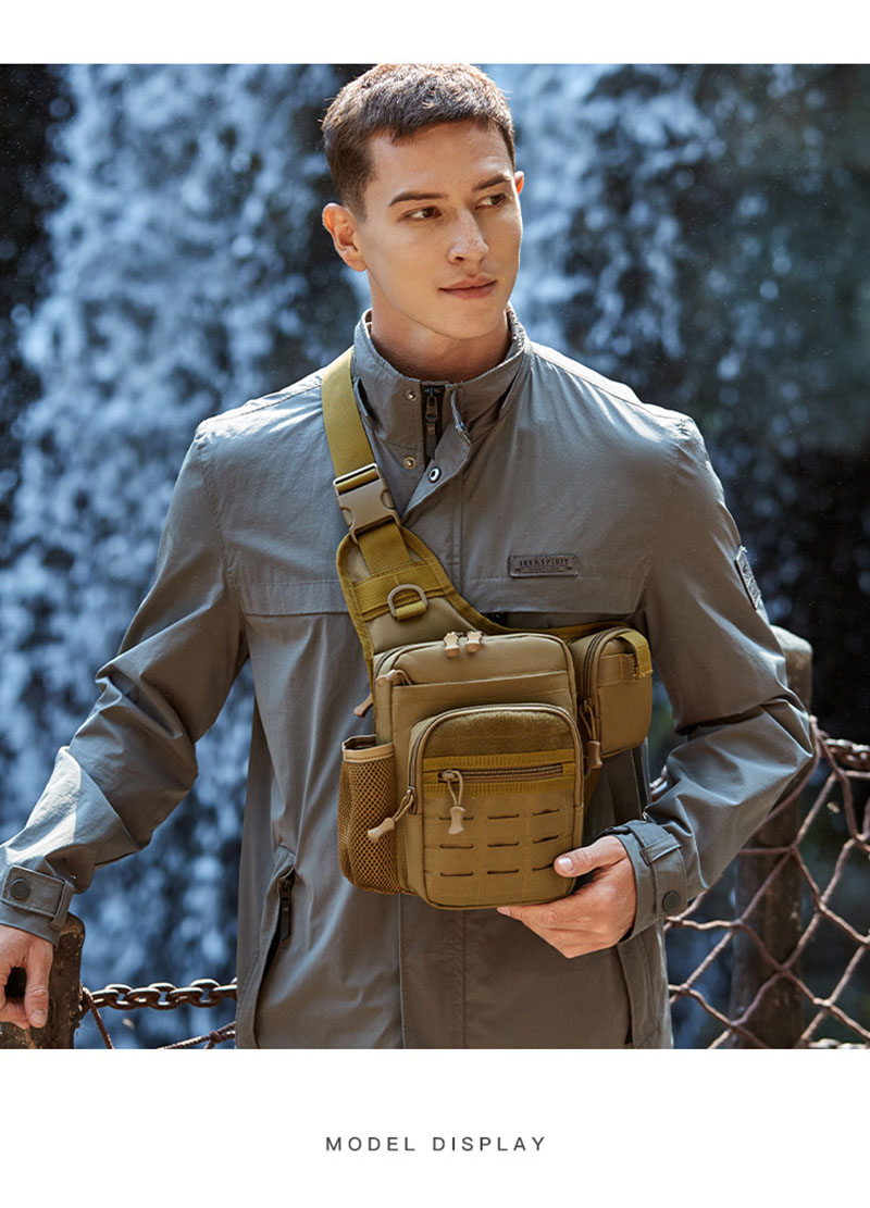 BG39 is a lightweight outdoor shoulder bag designed for practical daily carry, commuting, cycling, and short travel. With a structured multi-pocket layout, adjustable strap, bottle-friendly side compartment, and water-repellent fabric presentation, it offers compact organization in a clean tactical-casual style.
