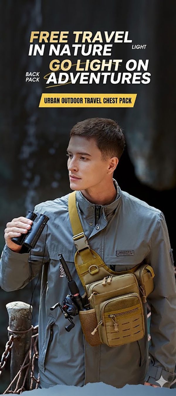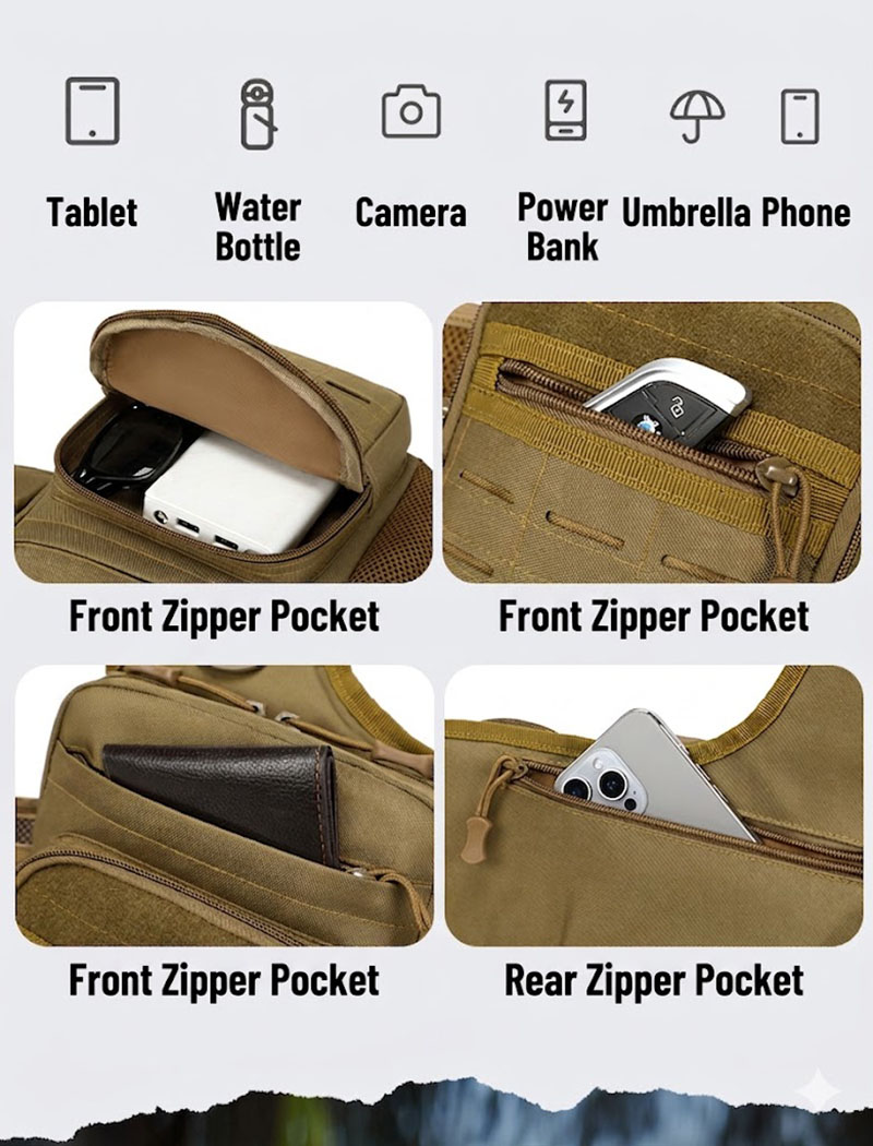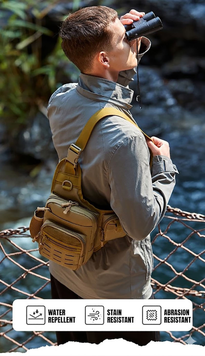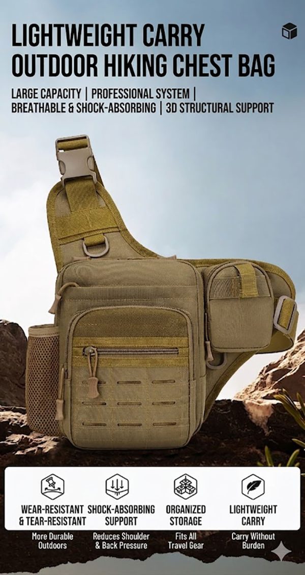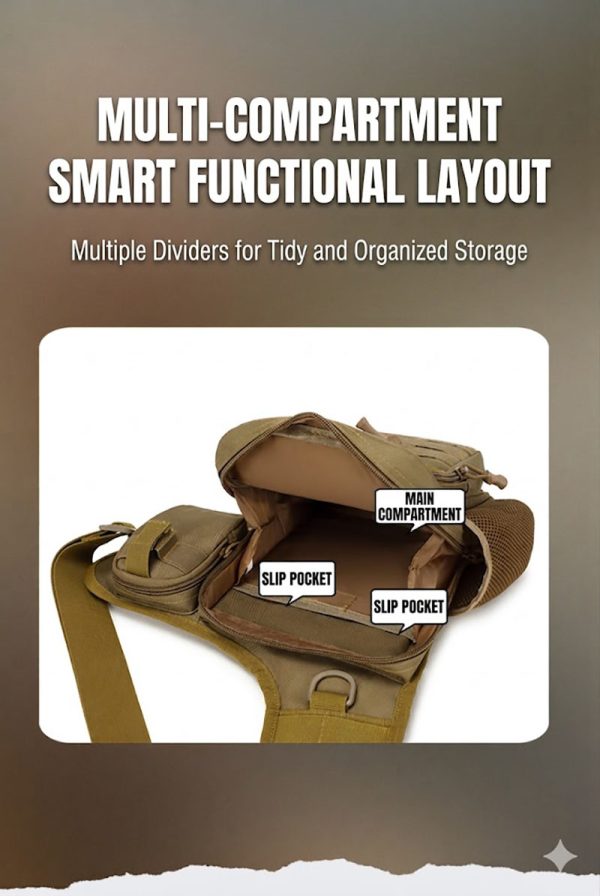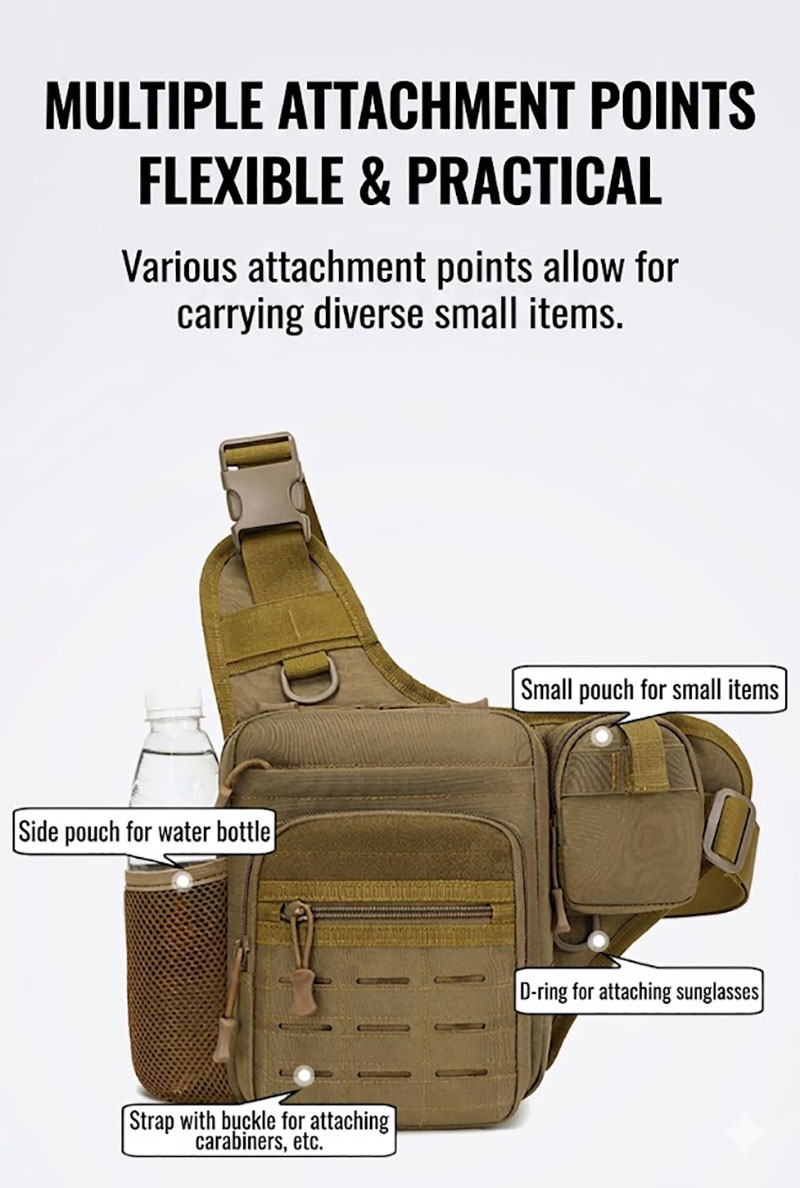 BG39 is a lightweight outdoor shoulder bag designed for practical daily carry, commuting, cycling, and short travel. With a structured multi-pocket layout, adjustable strap, bottle-friendly side compartment, and water-repellent fabric presentation, it offers compact organization in a clean tactical-casual style.