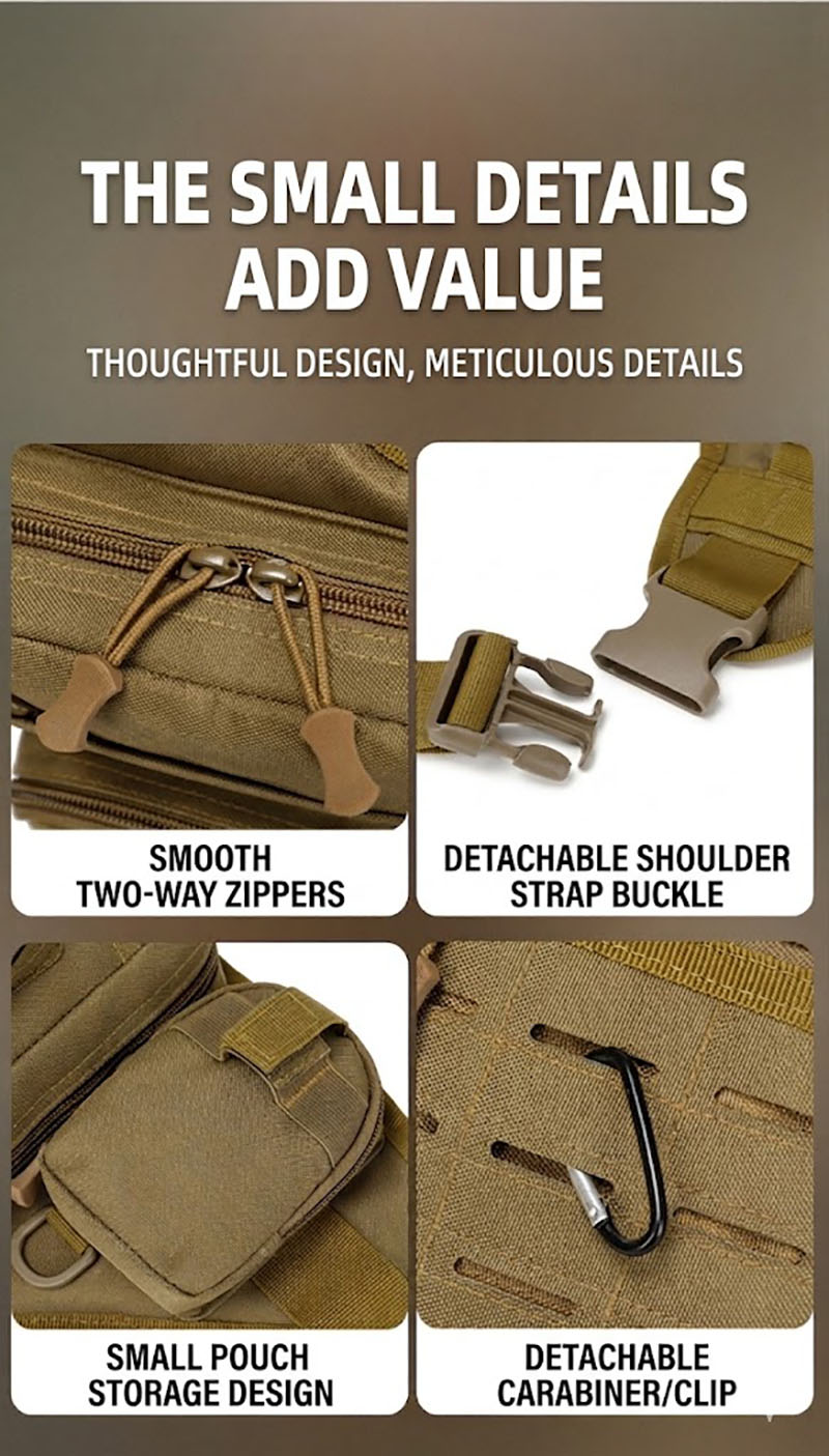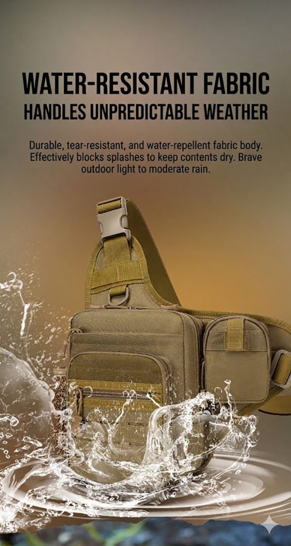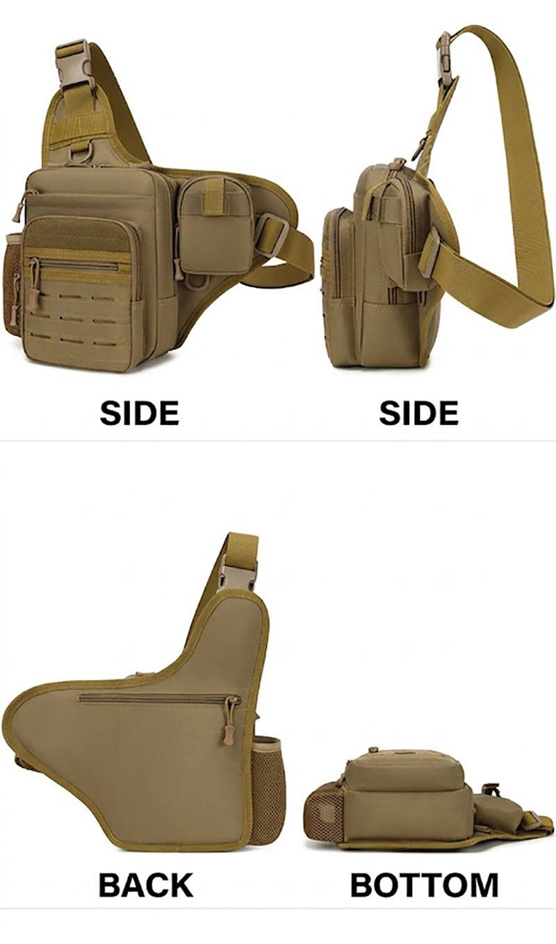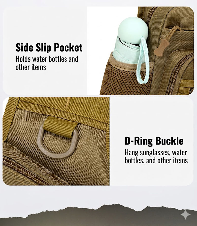 Durable Utility Details for Everyday Use The water-repellent style fabric, scratch-resistant surface presentation, smooth zippers, D-ring attachment point, and side pocket all add more practical value to BG39. These details help the bag feel more dependable for changing daily conditions while still maintaining a clean tactical-casual look. The side pocket is also useful for carrying a bottle or similarly sized item, which adds extra convenience for customers who spend more time outside.