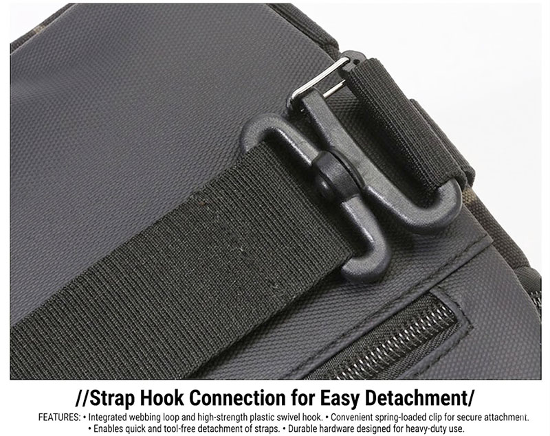 - Detachable shoulder strap with reinforced hardware connection