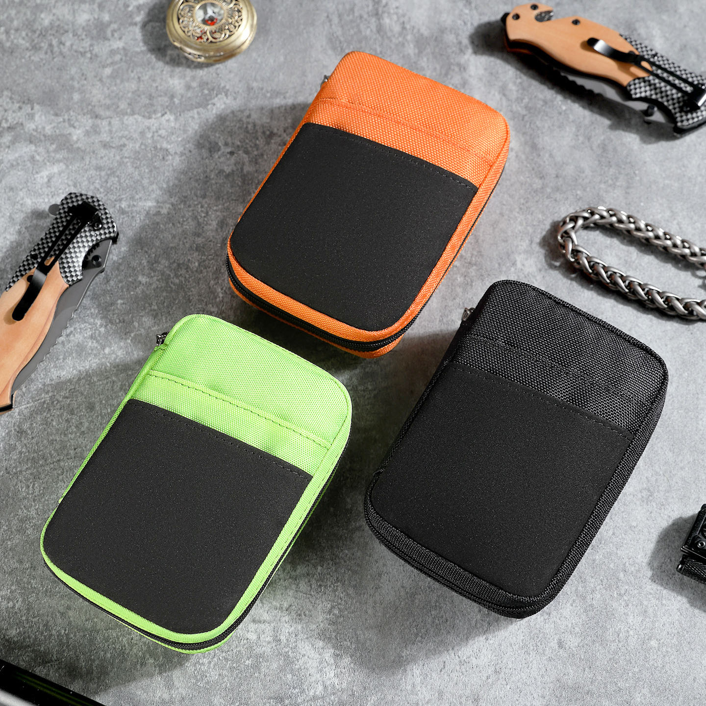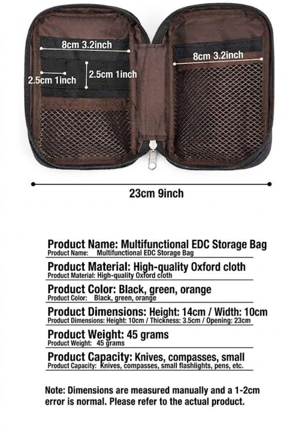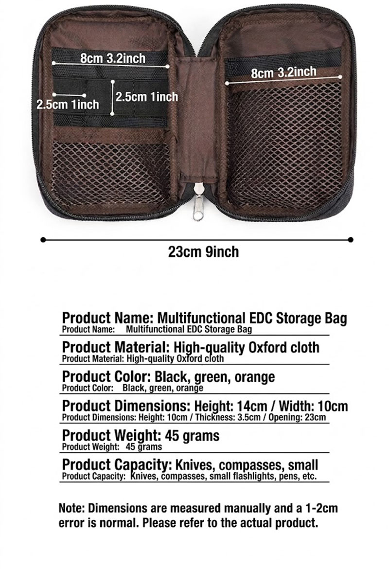 5. Color Options and Product Details This product is available in practical color options including black, green, and orange. Based on the product information shown, the pouch measures about 14 cm in height, 10 cm in width, and 3.5 cm in thickness, with an opening width of about 23 cm and a light weight of around 45 grams. It is a compact storage solution for people who prefer organized everyday carry without unnecessary bulk.