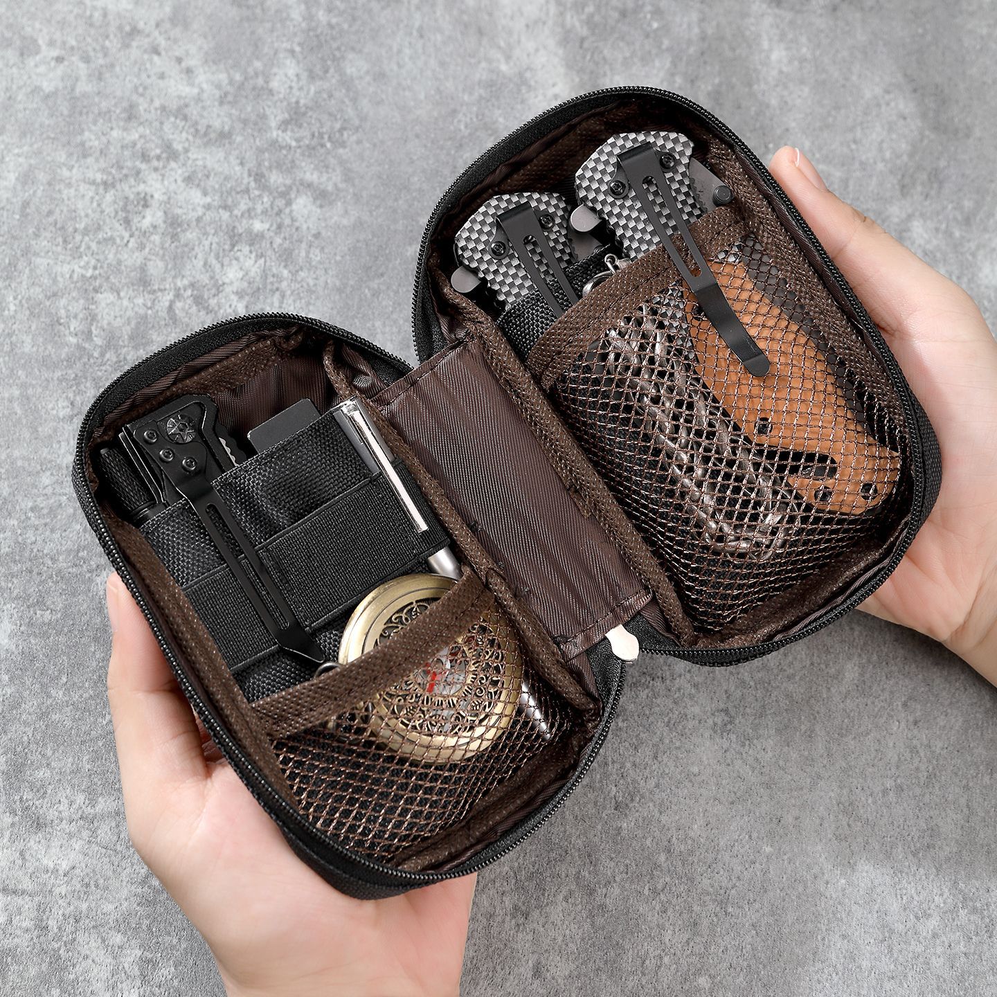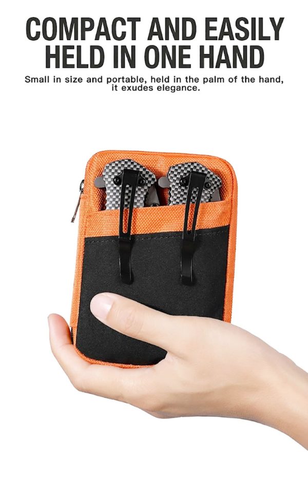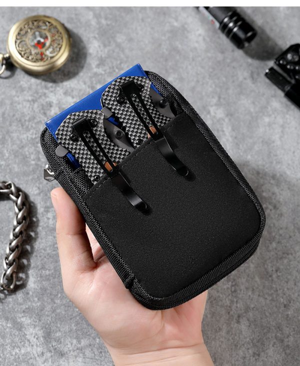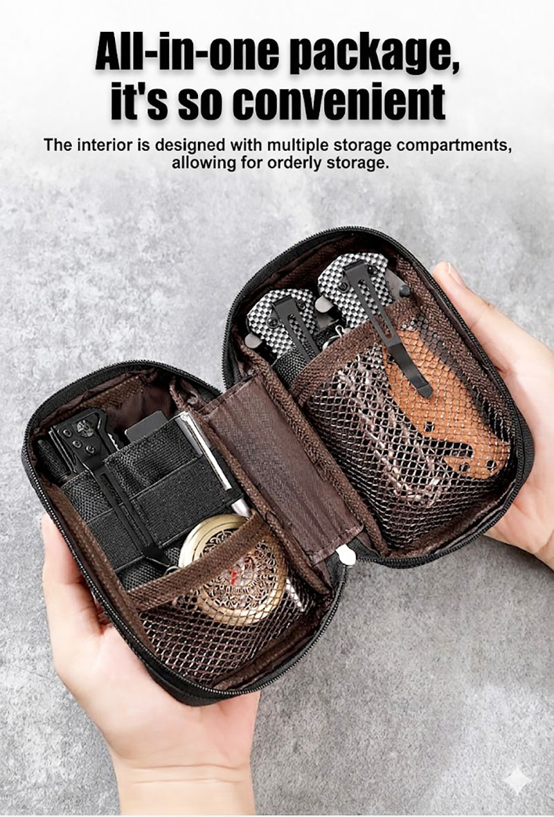2. Organized Storage Inside The interior is arranged to help separate small items instead of letting them mix together loosely. Mesh pockets and elastic-style holding sections create space for coins, cards, keys, pens, compact flashlights, pocket tools, and similar small accessories. There is also an outer pocket for quick-access items, which makes the pouch more practical when you need to reach for something fast.