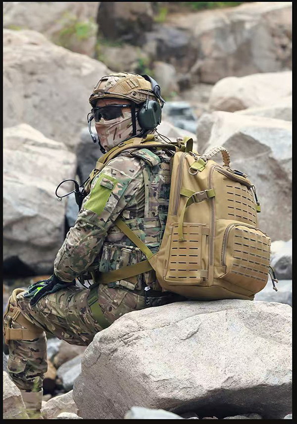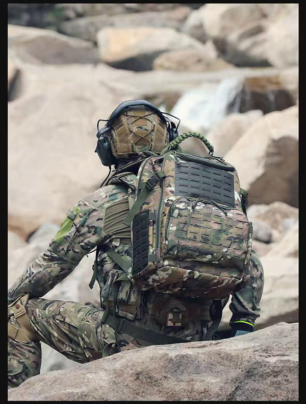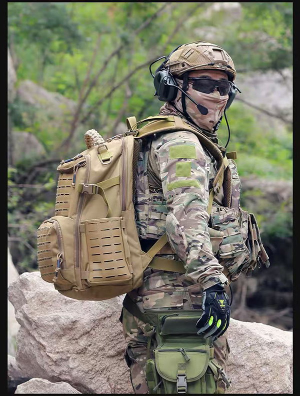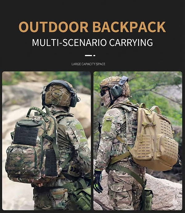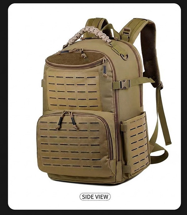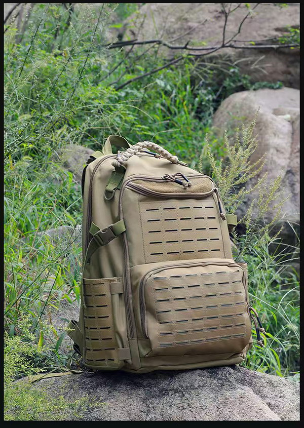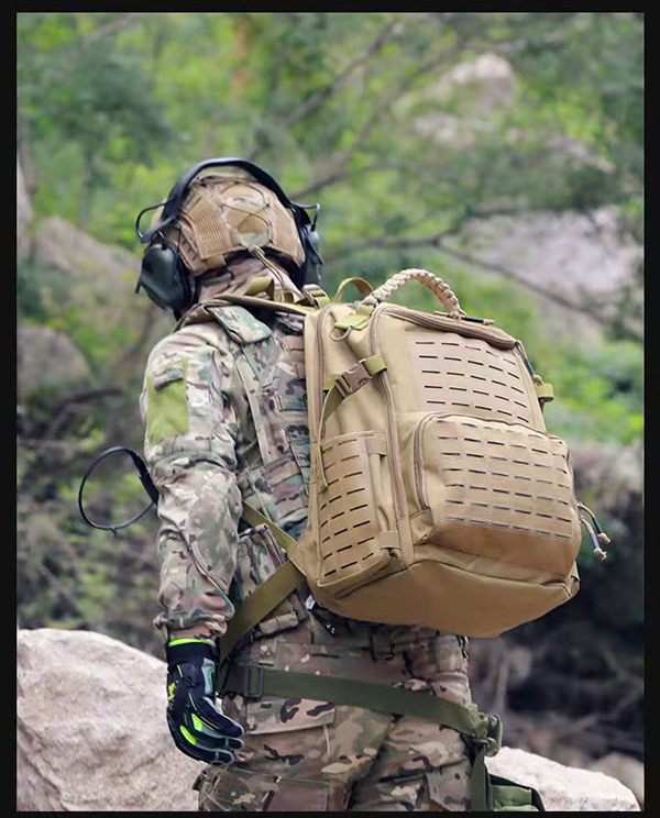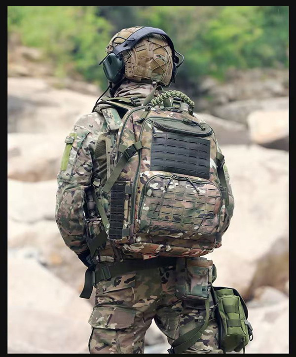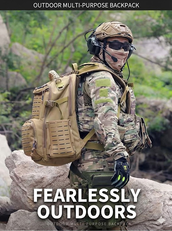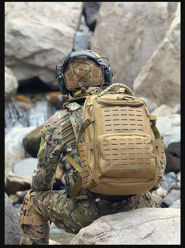 - Tactical outdoor backpack design with a laser-cut style front panel.