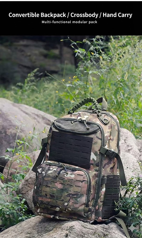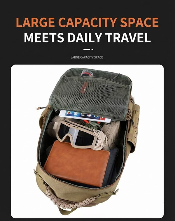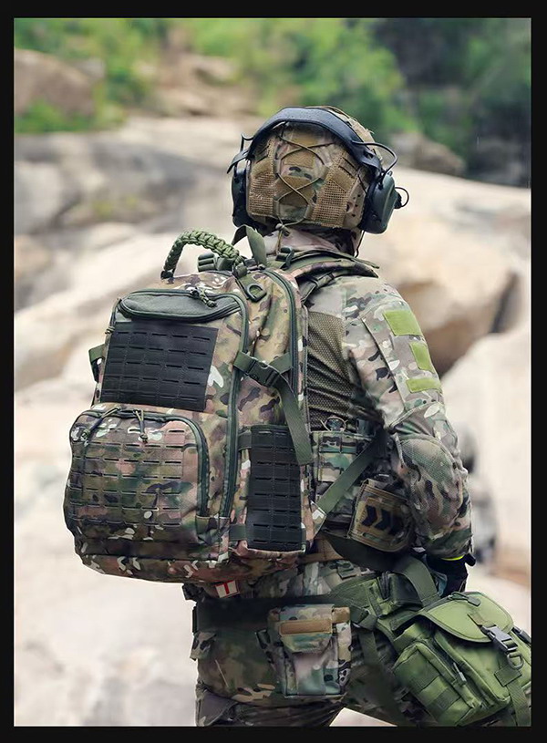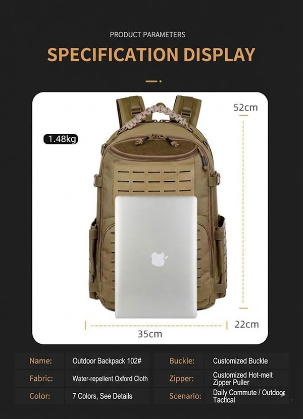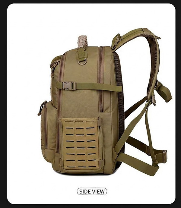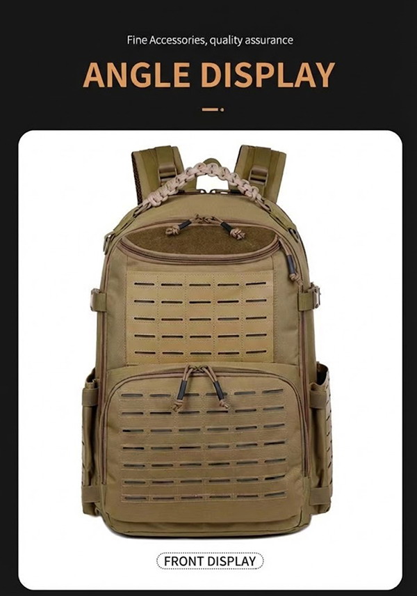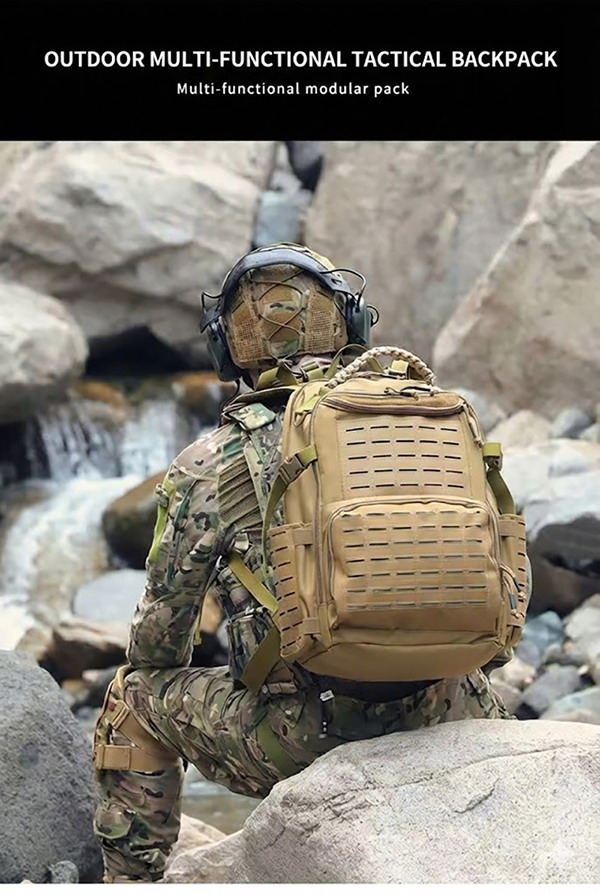 The BP01-7C is a rugged tactical outdoor backpack with a structured silhouette and a practical multi-pocket layout. It stands out with a laser-cut tactical front panel, a wide-opening main compartment, a breathable padded back, and fabric presented as water-repellent, making it suitable for outdoor trips, commuting, and everyday gear carry.