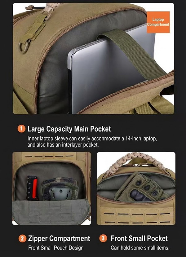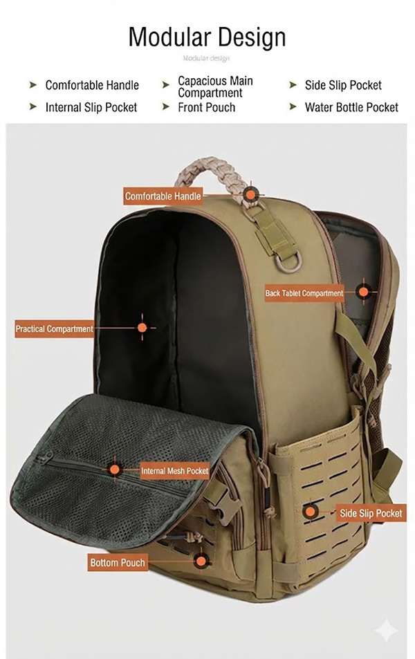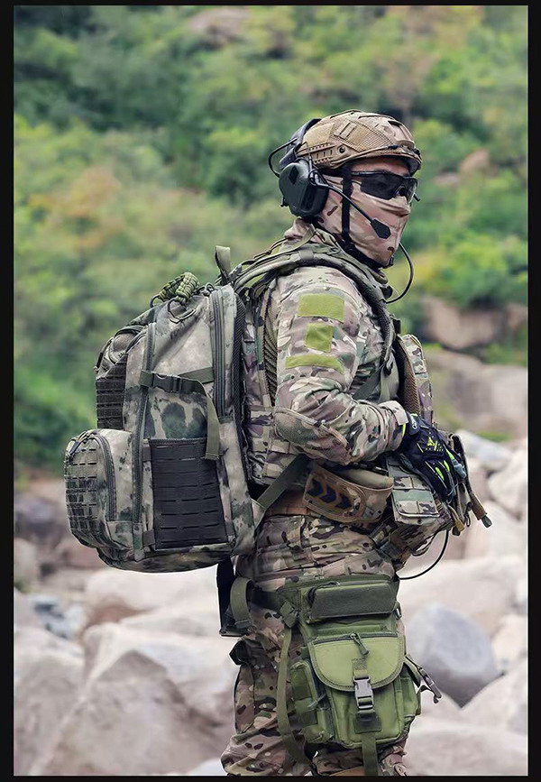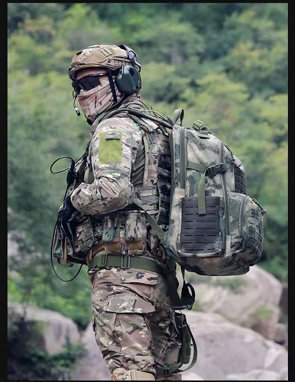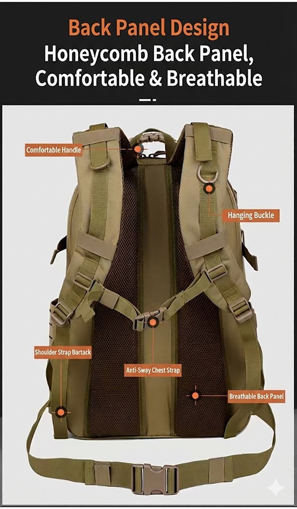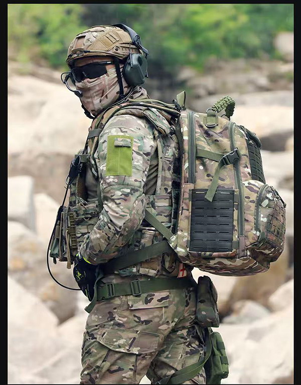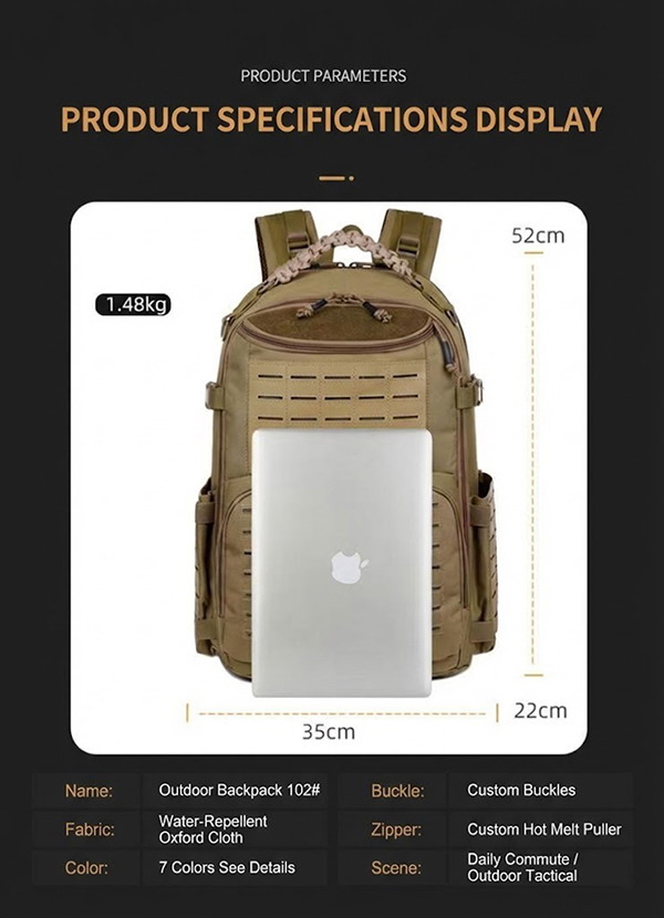 The BP01-7C is a rugged tactical outdoor backpack with a structured silhouette and a practical multi-pocket layout. It stands out with a laser-cut tactical front panel, a wide-opening main compartment, a breathable padded back, and fabric presented as water-repellent, making it suitable for outdoor trips, commuting, and everyday gear carry.