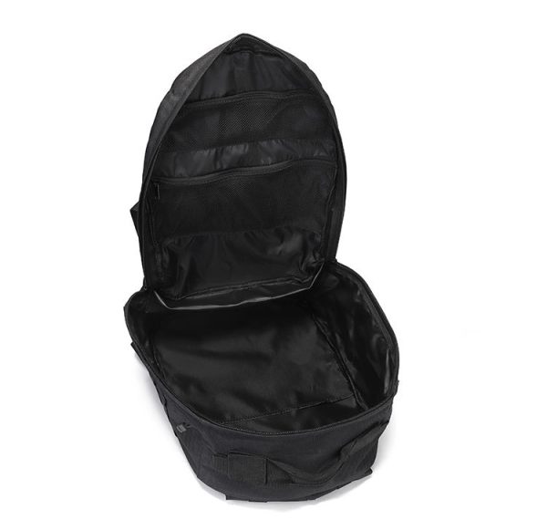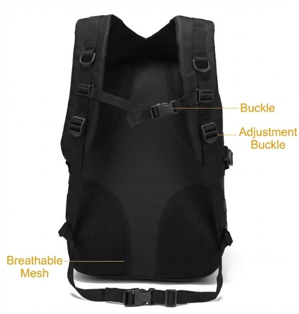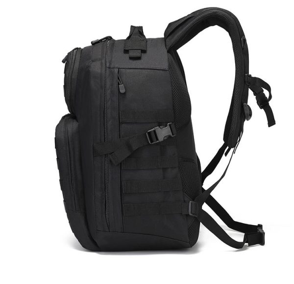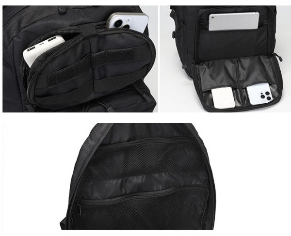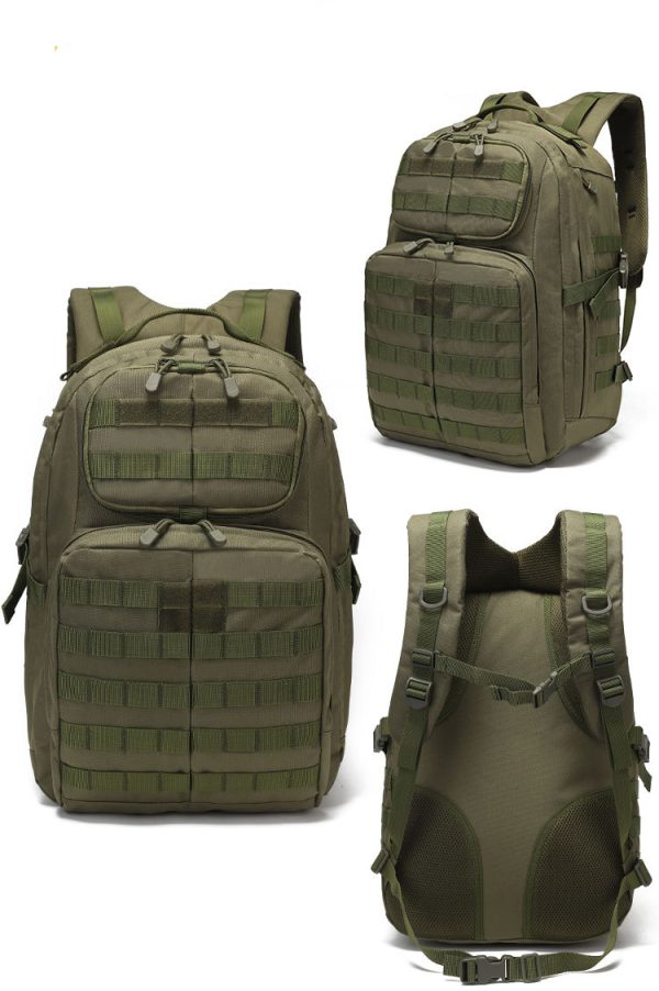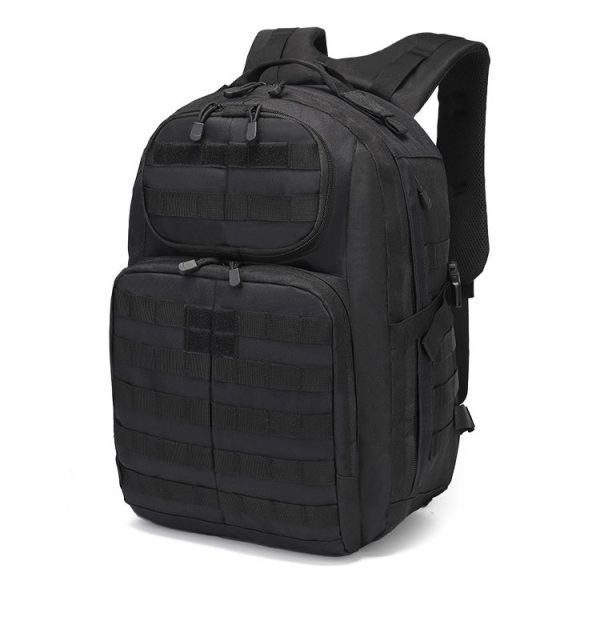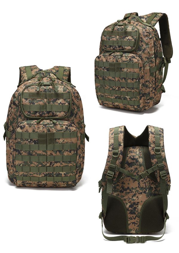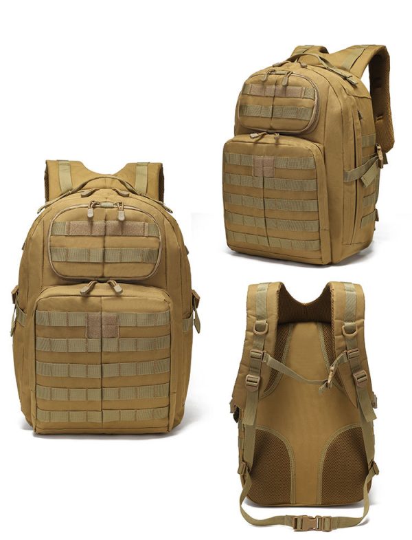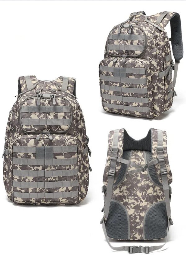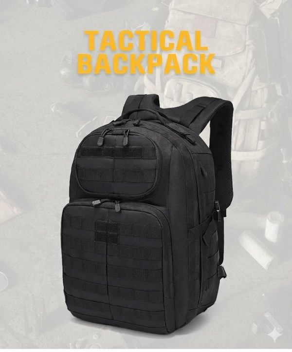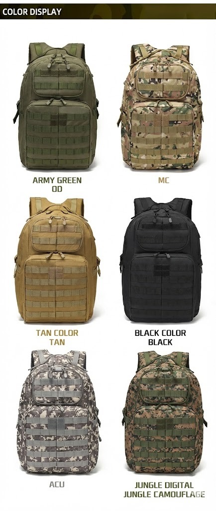 The backpack is presented in several colorways including black, coyote/khaki, army green, and camouflage versions. This gives it flexibility for users who want a simple everyday look or a more rugged outdoor/tactical style. It is a practical choice for anyone who prefers a compact backpack with bold detailing and organized storage.