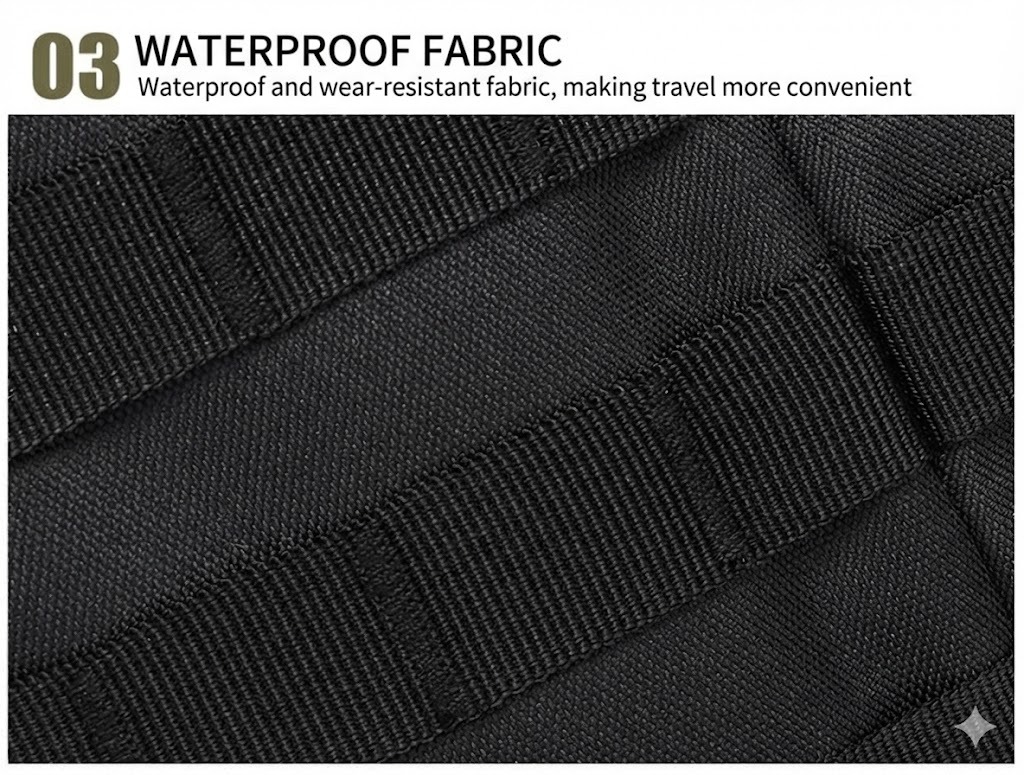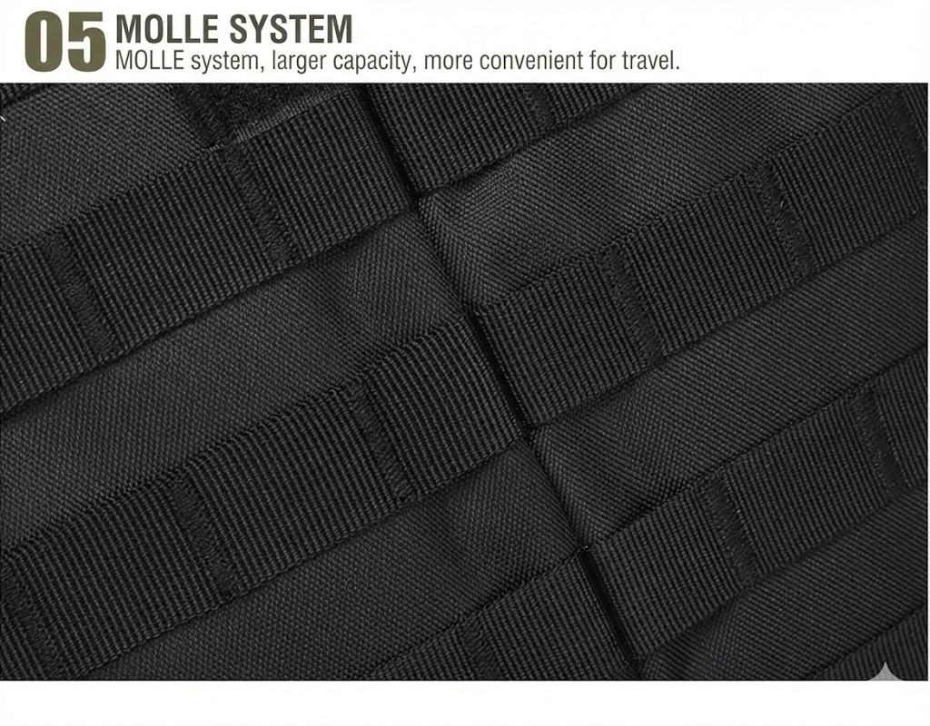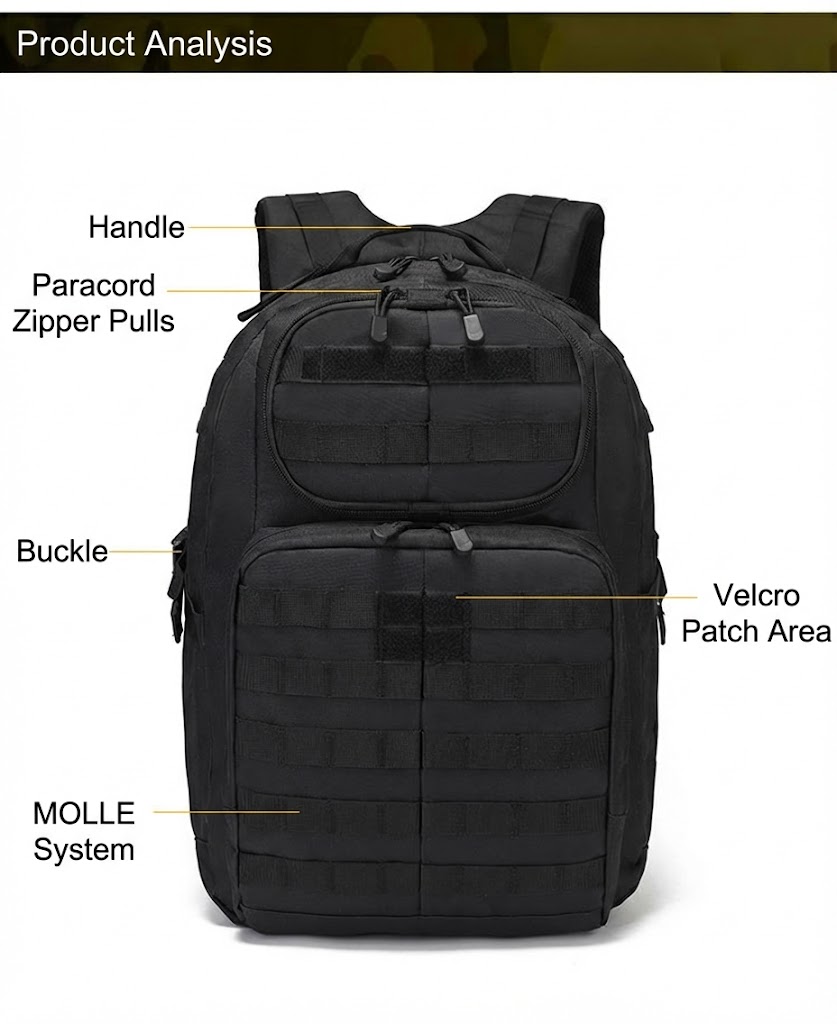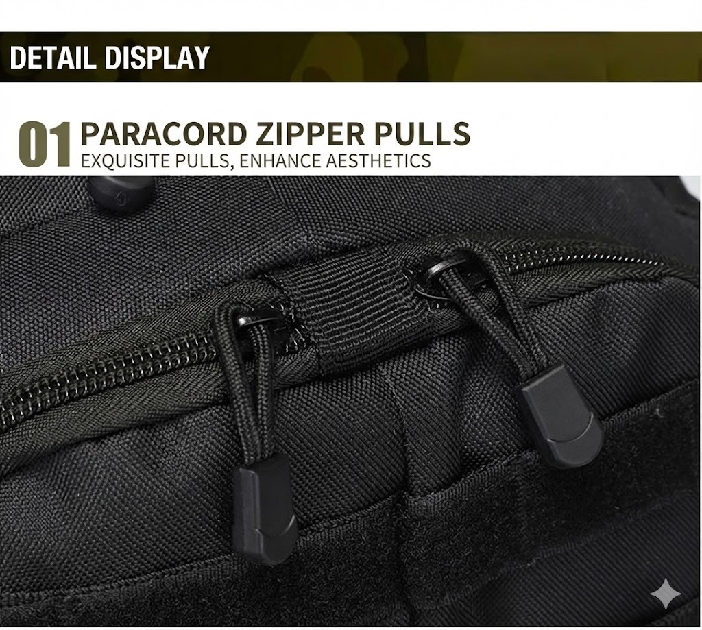 The zipper pulls use paracord-style tabs, which are easier to grip and match the tactical look of the backpack. The product visuals also highlight a water-repellent fabric surface for light outdoor use. A front hook-and-loop patch area and MOLLE webbing add both style and modular practicality for attaching extra pouches or accessories.