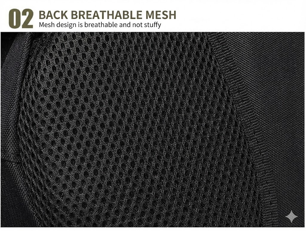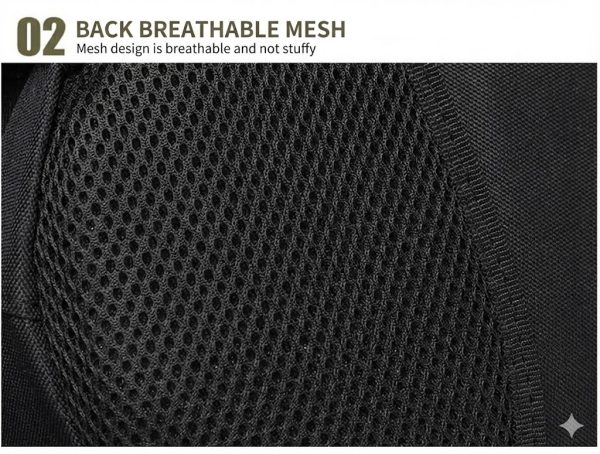 The rear side is shown with breathable mesh panels and supportive shoulder straps to make carrying more comfortable. Additional rear buckles and adjustment points help improve stability while moving. The overall setup suggests a bag built for convenience, mobility, and steady day-to-day performance.