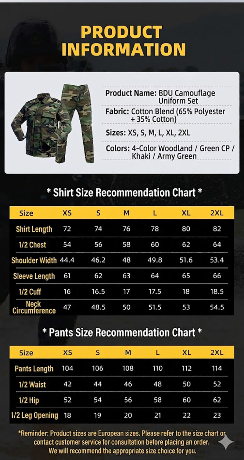 Complete Tactical BDU Set for a Strong Field-Ready Look FS01 is designed for customers who want a full uniform-style outfit that looks practical, organized, and ready for action. This two-piece set combines a long-sleeve field jacket with matching cargo pants, creating a coordinated tactical look that feels more complete than buying separate pieces. It is a strong option for customers who enjoy military-inspired clothing, outdoor utility wear, and workwear-style outfits with a more rugged identity. Built for Outdoor Training, Workwear, and Everyday Tactical Styling This set works naturally for outdoor training, hiking, camping, airsoft, and utility-focused daily wear. The overall design gives you a balanced look that feels capable without becoming too bulky, which makes it suitable for both practical use and tactical fashion. For customers who enjoy field-inspired gear, FS01 delivers the kind of structured jacket-and-pants combination that feels ready for movement while still staying wearable for regular day-to-day use. Field Jacket Design with Practical Storage The jacket gives FS01 much of its tactical character. It features a collared long-sleeve design with multiple front utility pockets that add both function and a stronger outdoor-ready appearance. Details such as the adjustable cuff finish and shoulder structure help reinforce the classic field-jacket look, making the top feel more purpose-driven than a standard casual outer layer. This gives the set a more disciplined, military-inspired profile that many tactical and outdoor customers will appreciate. Matching Cargo Pants for a Clean and Functional Uniform Look The matching pants complete the set with a straight, practical silhouette and cargo-style utility layout. They are designed to work visually with the jacket while still offering everyday usefulness and easier movement. The result is a coordinated outfit that looks clean and organized, whether worn for training, outdoor activity, or casual tactical styling. This matching design is especially appealing for customers who want a ready-to-wear uniform-style set instead of mixing individual pieces. Reinforced Construction with Rugged Everyday Appeal One of the biggest selling points of FS01 is its reinforced, heavy-duty presentation. The set is positioned with tear-resistant, scratch-resistant, and reinforced seam details that give it a tougher and more dependable image. That makes it especially attractive for customers who want clothing that feels more suitable for regular movement, outdoor routines, and utility use. Even for casual wear, this rugged construction adds confidence and gives the set a more serious tactical character. Easy to Wear in Cambodia for Utility-Focused Daily Use For customers in Cambodia, FS01 works well as a practical option for outdoor movement, daily utility wear, weekend activity, and tactical-inspired casual outfits. The structured design gives good coverage and a capable look, while the coordinated set makes it easy to dress for outdoor routines without much effort. For customers who like tactical and utility gear, it offers a complete outfit that feels functional, organized, and naturally suited to active everyday use. Color Options That Match Different Styling Needs FS01 gives customers flexibility through a range of finishes that can suit different tastes and uses. Camouflage versions bring a stronger tactical and field-ready attitude, while black and green keep the look cleaner and easier to wear for workwear-inspired outfits, utility styling, and everyday outdoor use. This makes the set appealing to customers who want either a more aggressive tactical look or a more understated practical outfit. A Reliable Tactical Set from New Way Smile Shop New Way Smile Shop offers FS01 as a dependable tactical BDU set for customers who want a coordinated field jacket and cargo pants combination with strong utility appeal. It is a smart choice for customers looking for a rugged, military-inspired outfit that works well for training, hiking, camping, airsoft, workwear-style use, and tactical everyday wear. For buyers in Cambodia who appreciate practical clothing with a stronger outdoor and combat-inspired image, FS01 delivers a solid balance of function, structure, and wearable style.