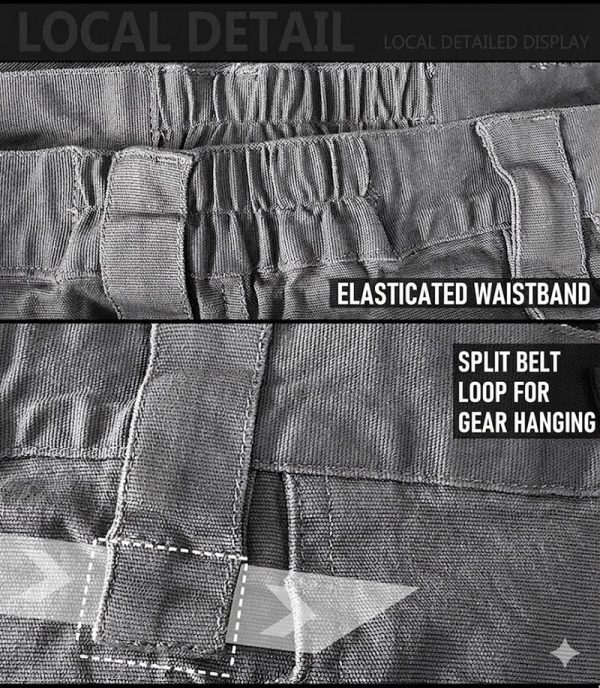 A close-up detail highlights the elasticated waistband, which supports a more adaptive and comfortable fit. Belt loops remain part of the design, so the pants can still be paired with tactical belts or casual belts for a more structured setup.