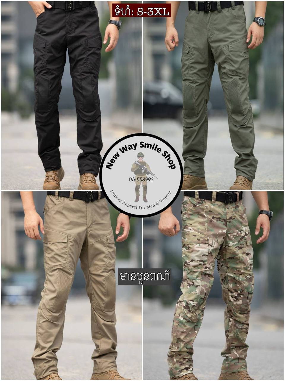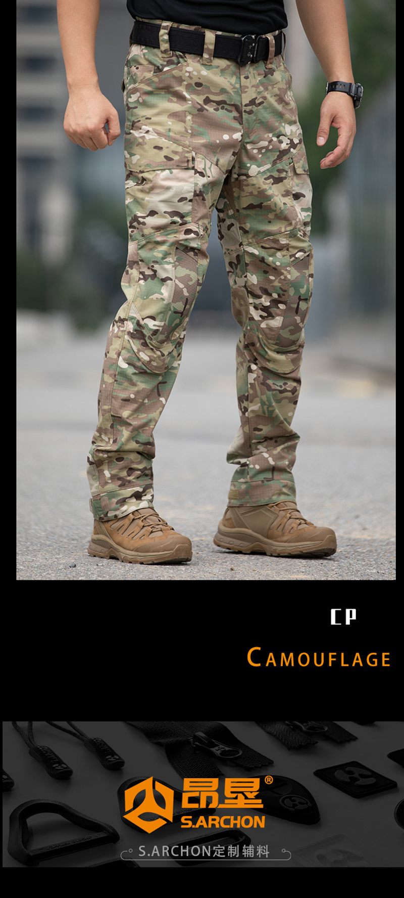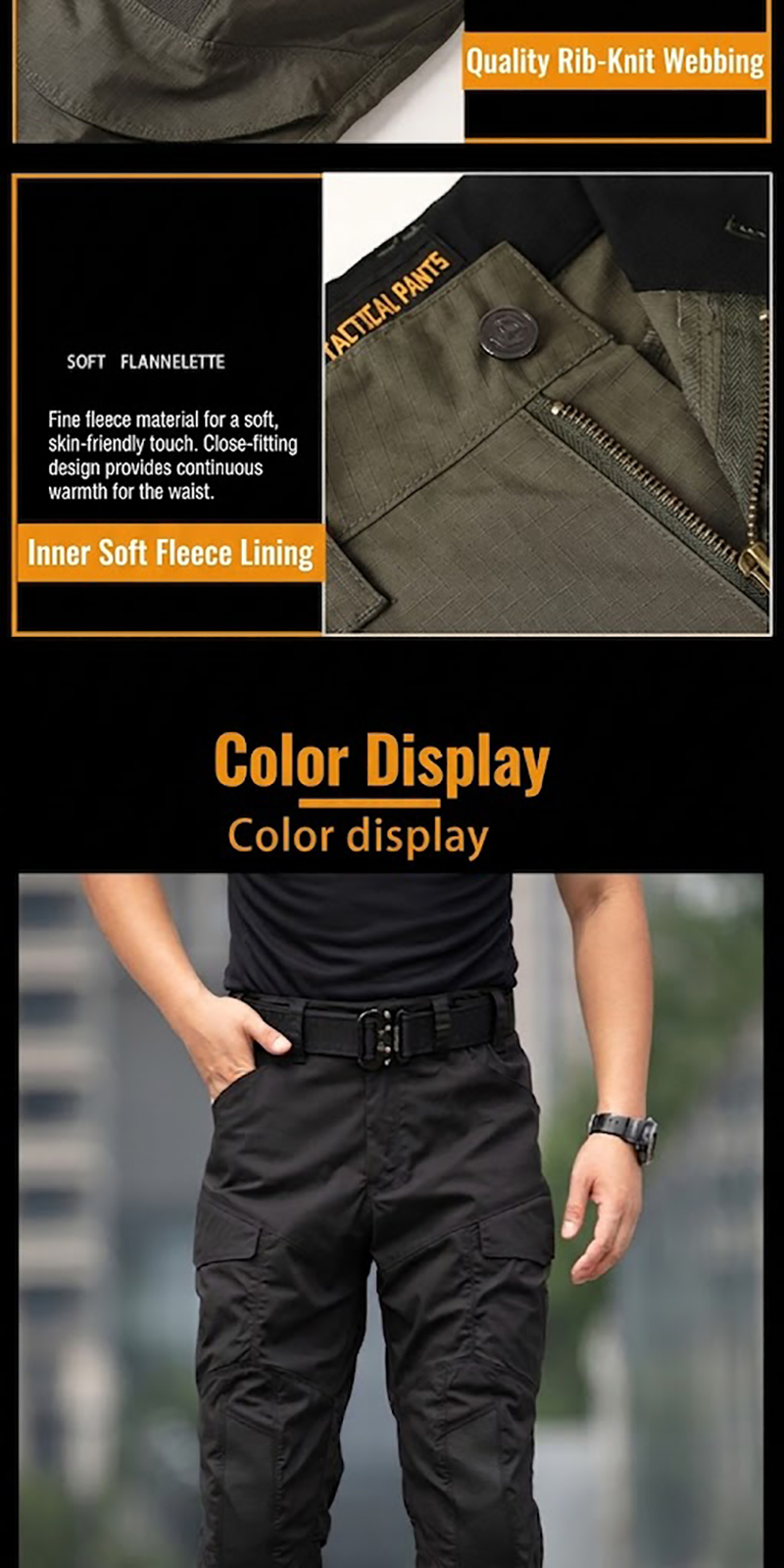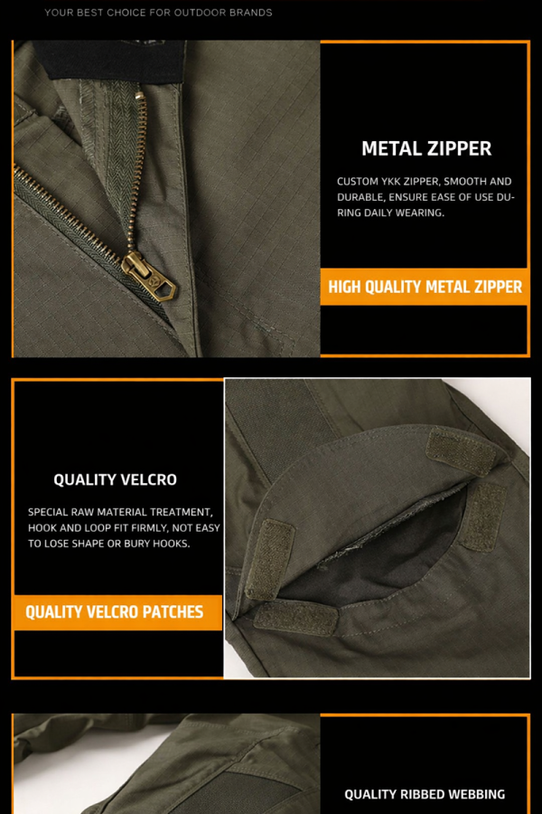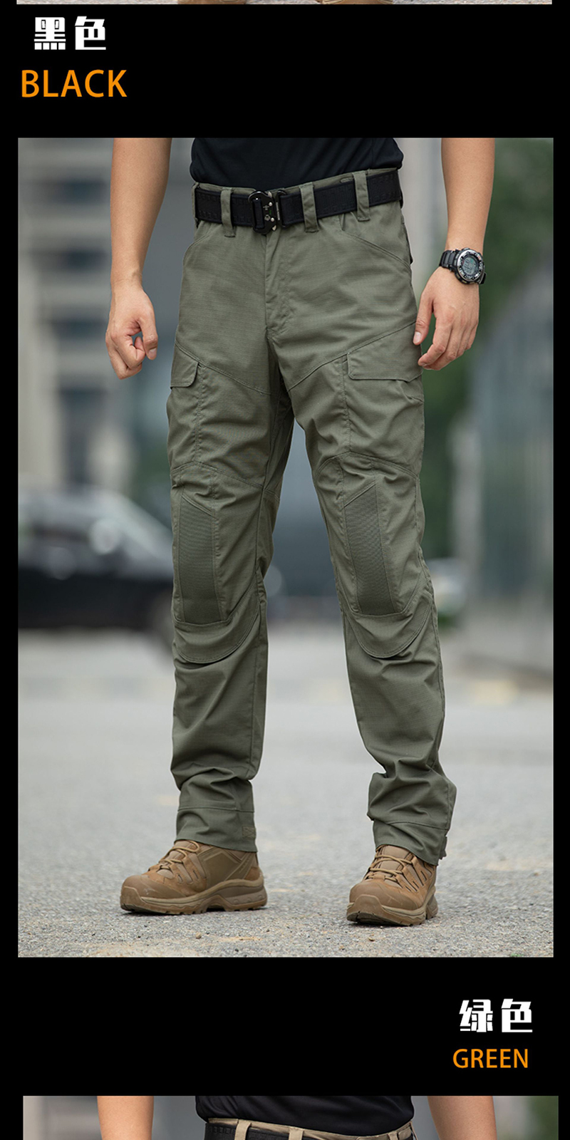 Close-up images also show reinforced belt loops, zipper construction, and hook-and-loop pocket details. These elements contribute to a practical utility feel while keeping the pants visually tidy. The waistband appears suitable for pairing with tactical belts, outdoor belts, or everyday casual belts.Color options and styling versatility