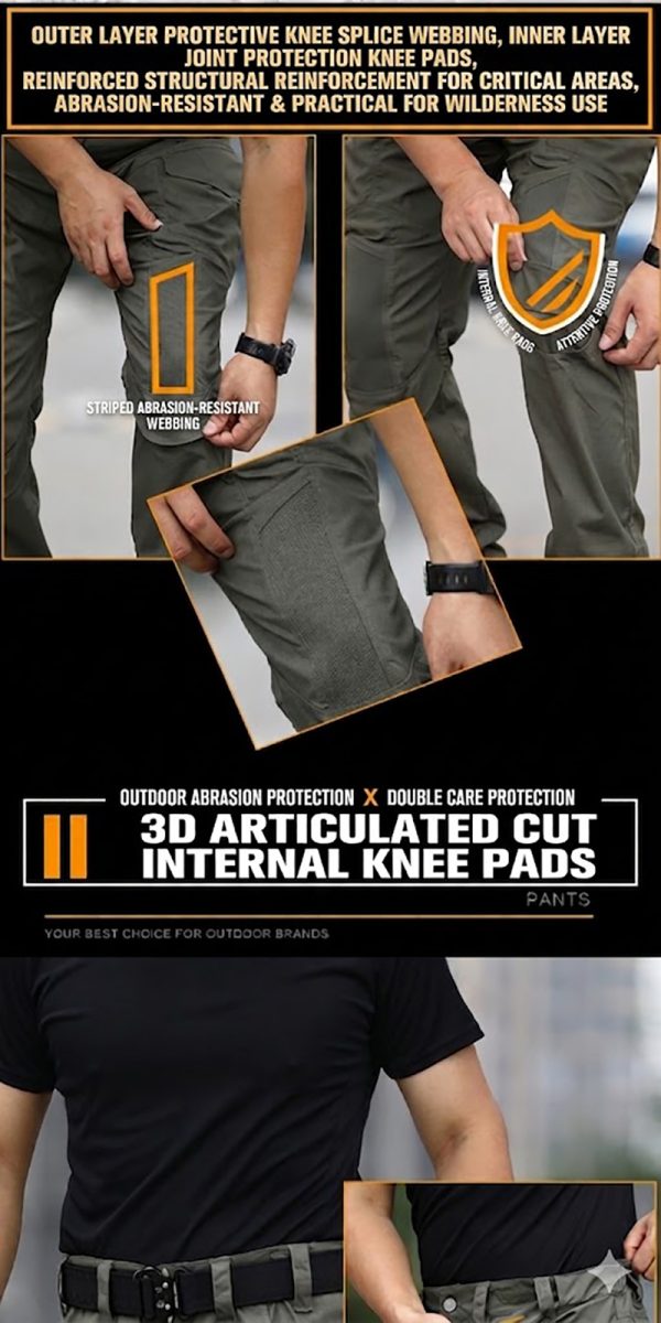 One of the highlighted details in the images is the articulated 3D knee area. This design gives the pants a more ergonomic shape through the leg, which can improve flexibility and comfort during walking, bending, climbing, or extended activity. The visual emphasis on the knee paneling suggests movement-friendly construction rather than a simple straight-leg design.Waist details and hardware finishing