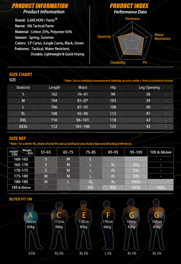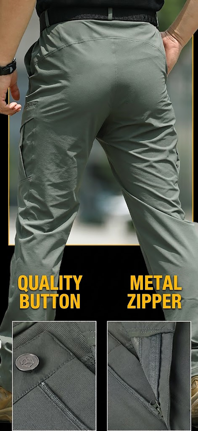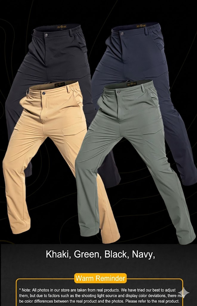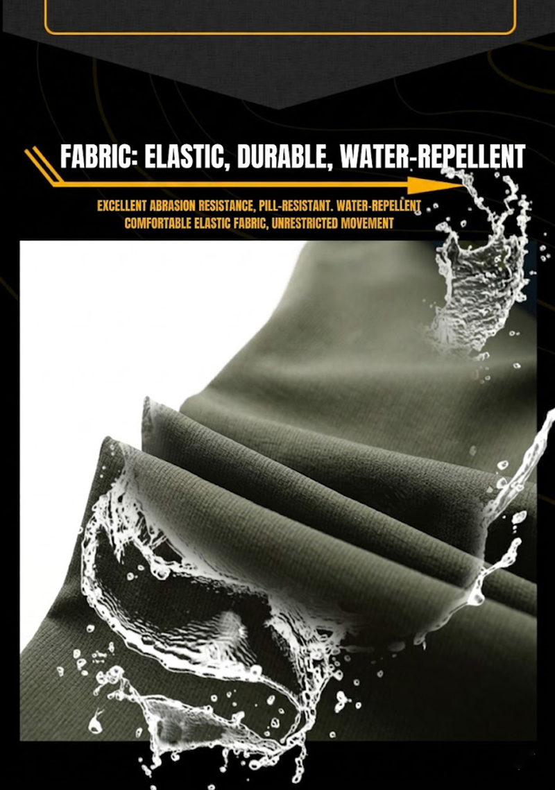 The fabric is presented as lightweight, elastic, durable, and water-repellent. That combination supports easier movement during walking, climbing, kneeling, or daily wear, while also helping the pants stay comfortable across changing conditions.