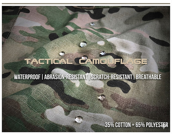 The material presentation highlights a cotton-polyester blend with a rugged surface that suits repeat wear. The fabric is positioned as suitable for outdoor use, with a finish that supports a tough appearance while remaining easy to integrate into daily outfits.