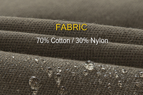 The pants use a tightly woven fabric with a textured surface that appears sturdy and dependable. The product information panel highlights a 70% cotton and 30% nylon blend, giving the material a balanced feel for comfort, durability, and active outdoor use.